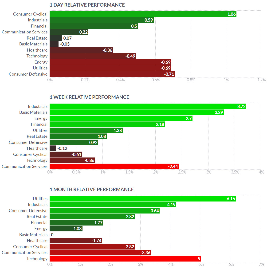 - 경기소비재(+0.75%), 금융(+0.71%), 산업재(+0.38%)를 제외한 필수소비재(-1.13%), 기술(-0.95%), 유틸리티(-0.92%) 등 전 업종에서 약세