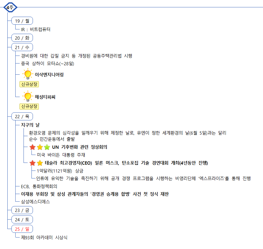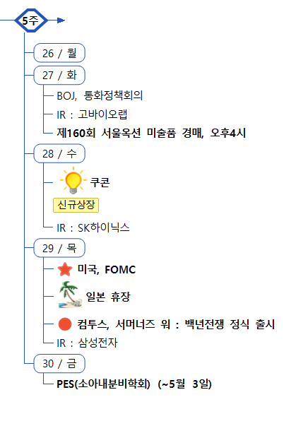 증시캘린더는 개인적으로 관련된 소식을 확인후 작성한 일정이라 변동 또는 오류의 소지가 있습니다.