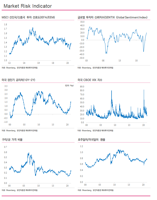 유럽증시는 코로나 재확산 우려와 바이든 행정부의 증세안에 약보합 마감. 전일 인도와 일본의 코로나 재확산 및 바이든 행정부의 자본소득세 인상안에 따른 투자 심리 위축은 유럽 증시에 영향을 미쳐 STOXX600지수는 0.1% 내린 439선 마감. 금일 유럽증시에서는 정보기술(+0.7%)과 소재(+0.6%) 섹터가 오름세를 시현했으며, 노르웨이 투자은행 DNB Markets이 노르딕 세미콘덕터(NOD NO)의 밸류에이션이 과소평가된 상태라며 매수 의견을 제시하자 금일 9.2% 올라 정보기술 섹터 상승을 주도. 소재 섹터는 비철금속 가격 상승에 따른 영향으로 상승 마감. 반면필 수소비재(-0.7%), 건강관리(-0.9%), 부동산(-1.1%)은 약세 시현. 한편, Refinitiv 데이터에 의하면 현재까지 STOXX600 지수 내 10%의 기업이 실적을 발표했으며, 이 중 67%가 컨센서스를 상회한 것으로 나타나 증시 하방 압력을 제한.
