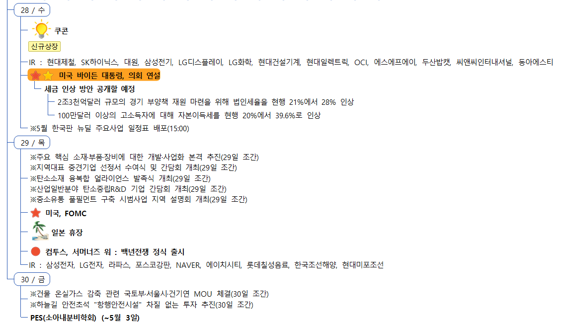 | 4월 28일(수) 증시캘린더 (0) | 2021.04.28 |
