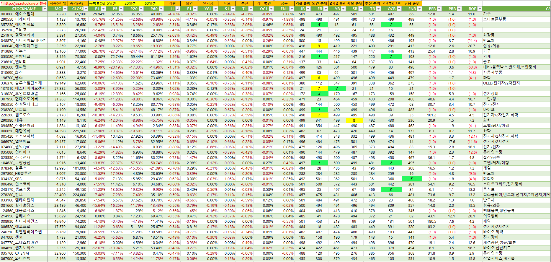 아래 자료는 재즈스탁의 데이터를 활용하여 장마감후 당일 시가총액대비 기관매수세가 큰 종목 순서로 작성하였습니다.
