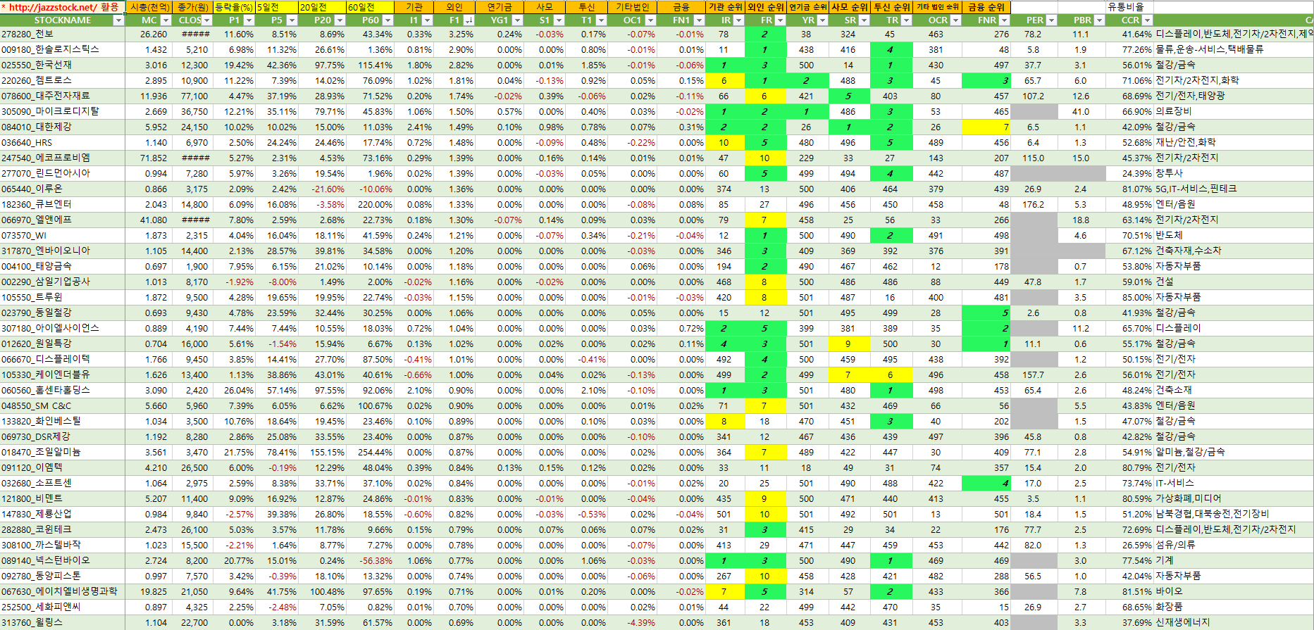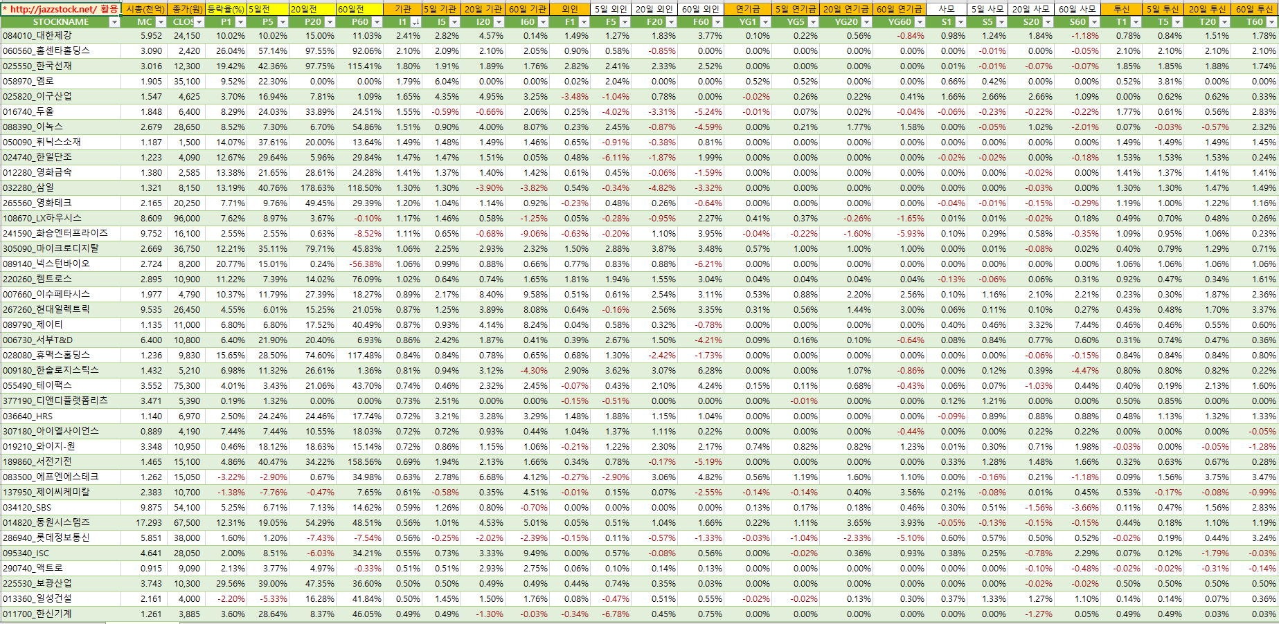 아래 자료는 재즈스탁의 데이터를 활용하여 장마감후 당일 시가총액대비 기관매수세가 큰 종목 순서로 작성하였습니다.