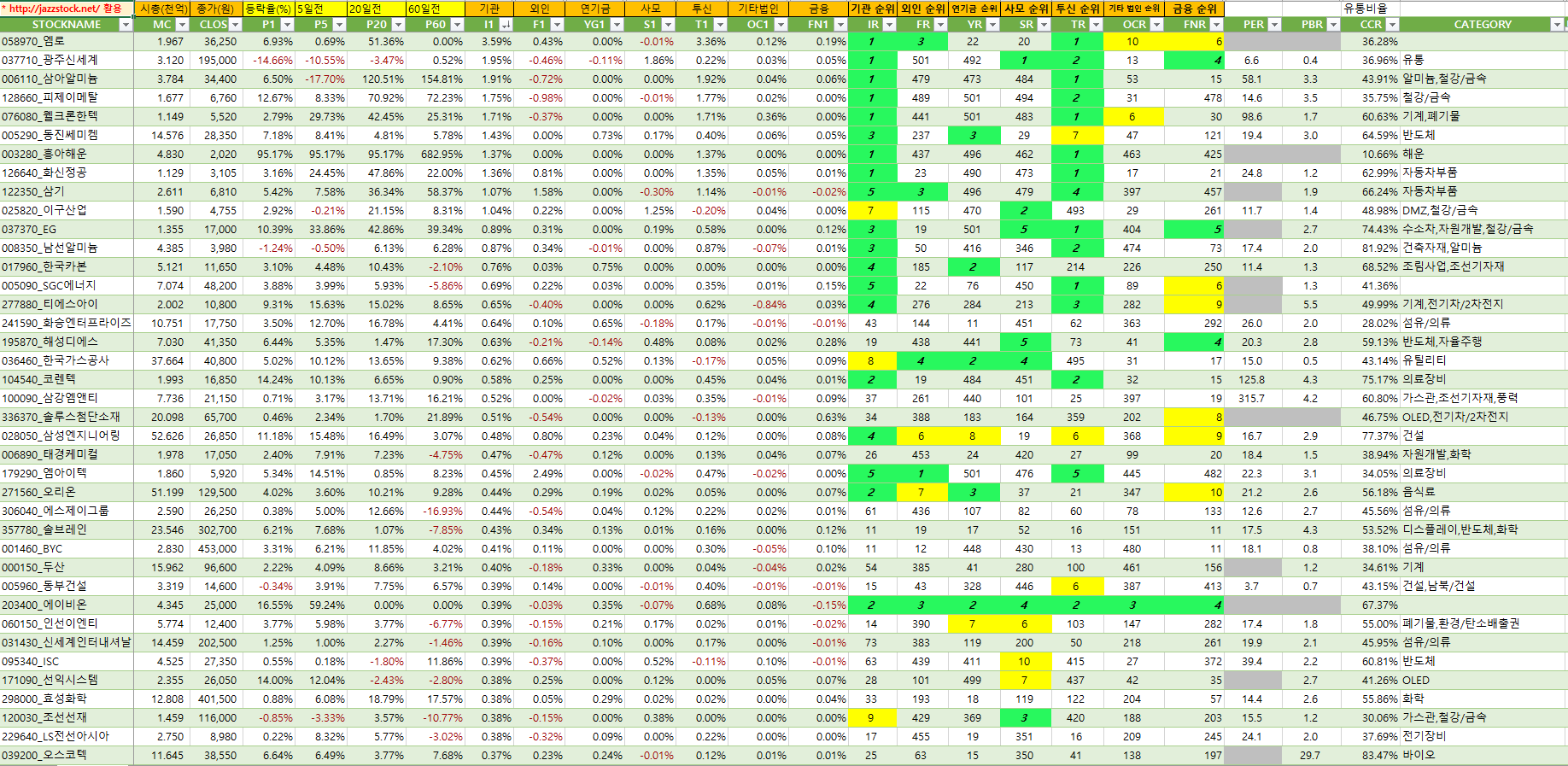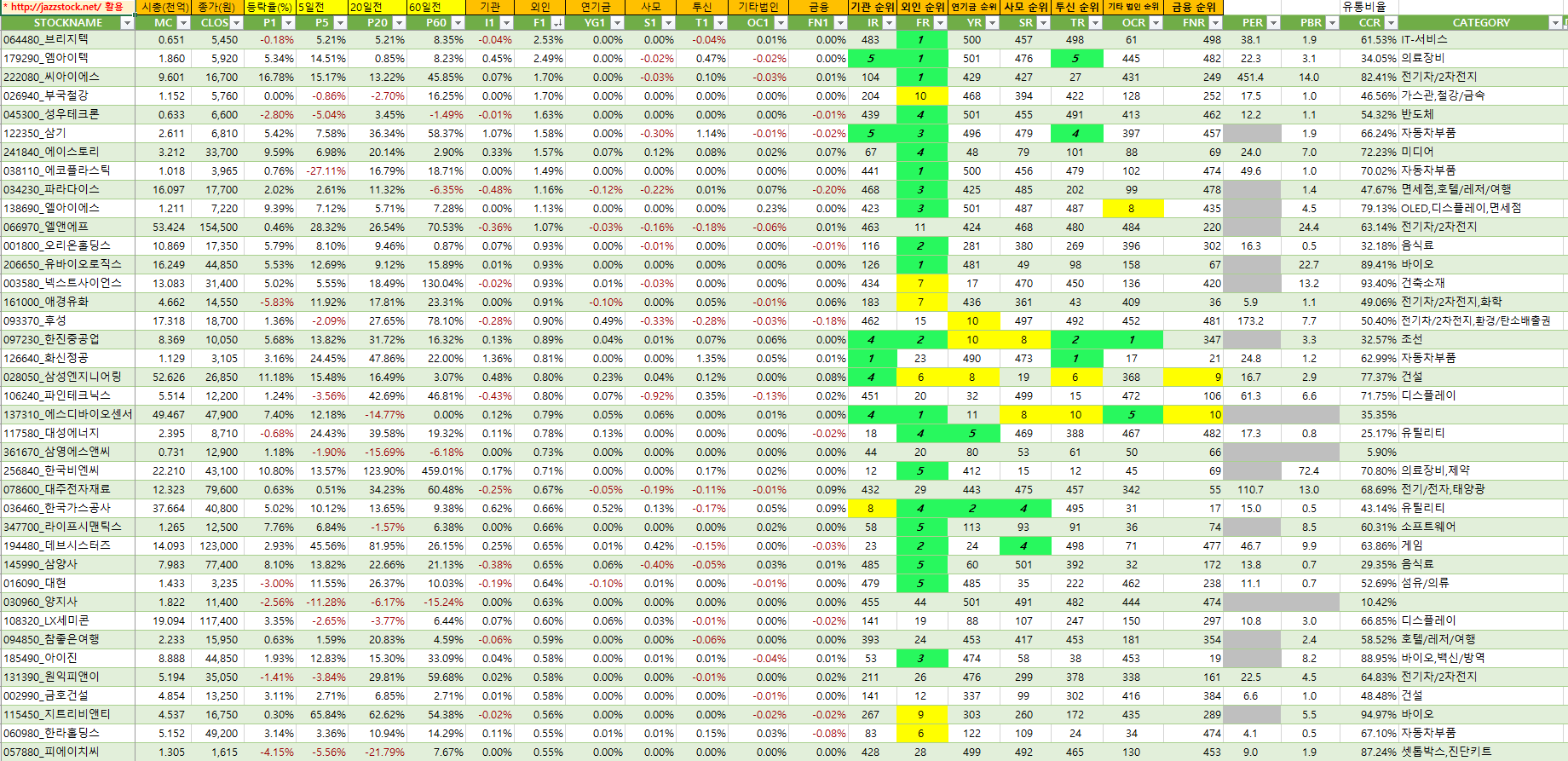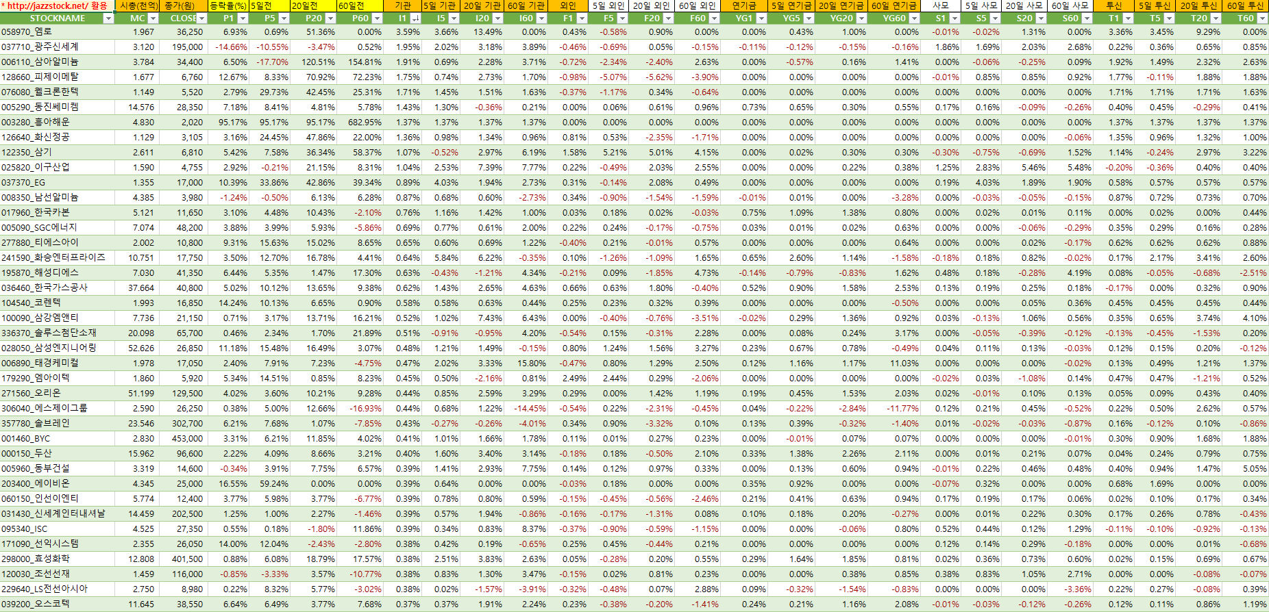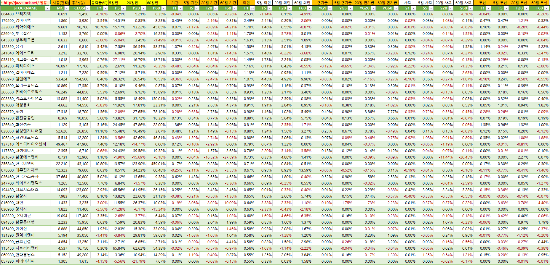 아래 자료는 재즈스탁의 데이터를 활용하여 장마감후 당일 시가총액대비 기관매수세가 큰 종목 순서로 작성하였습니다.