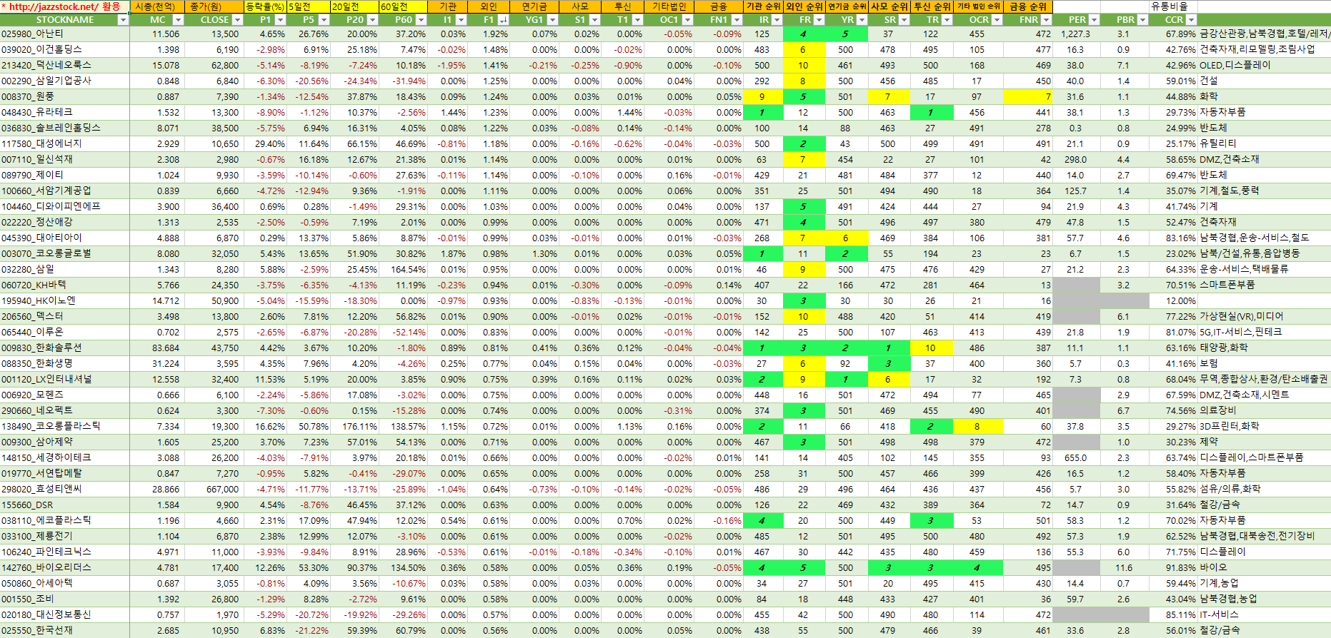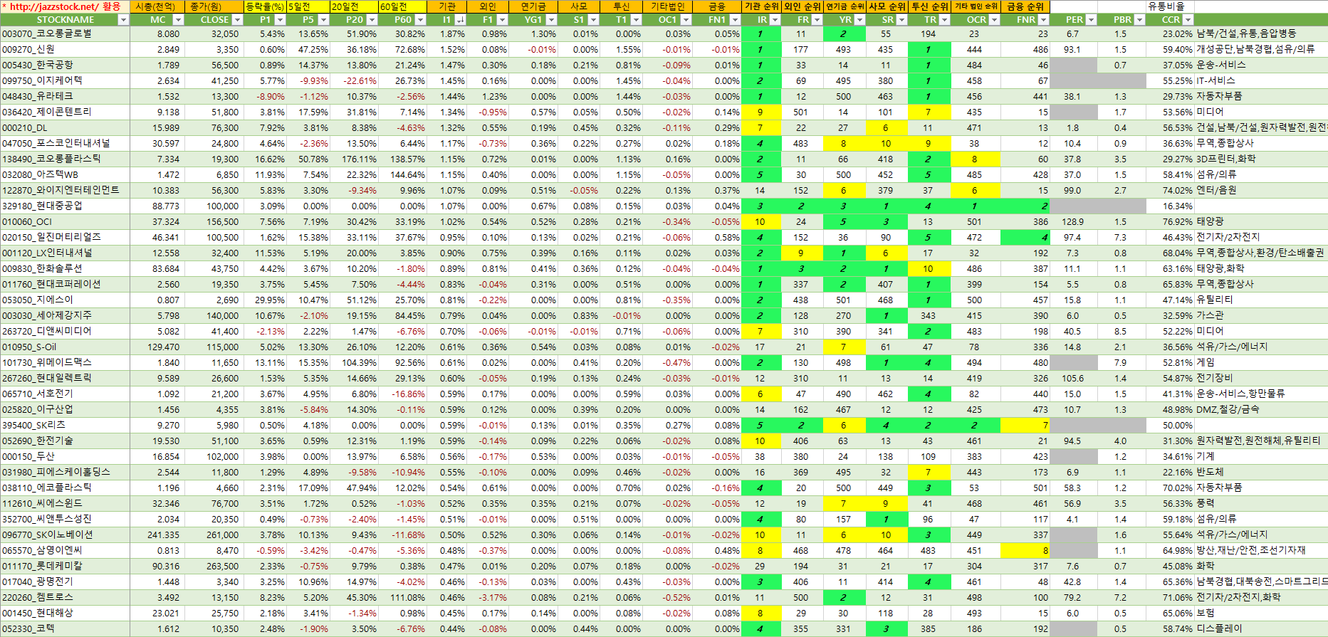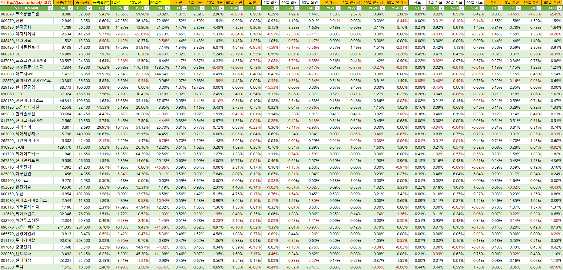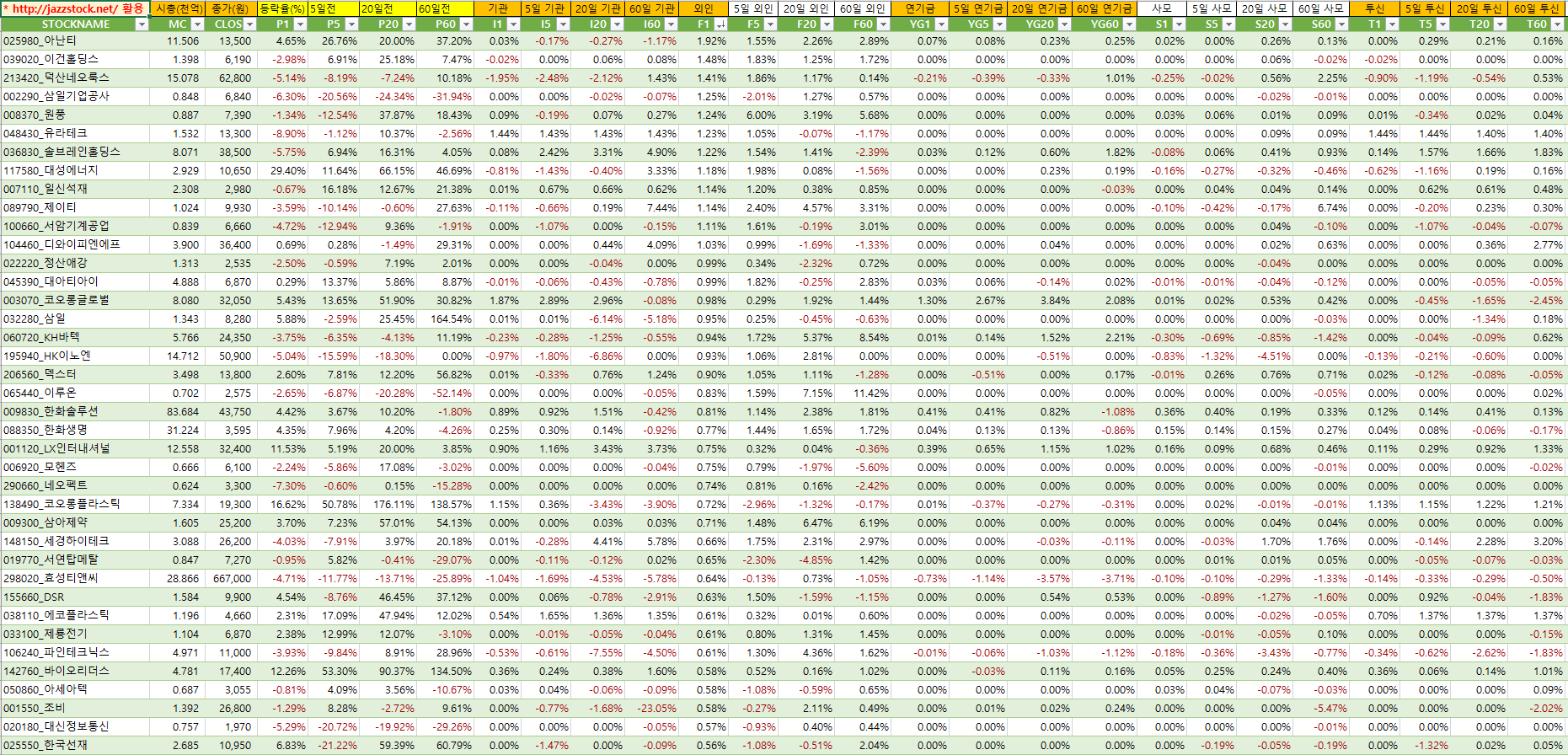아래 자료는 재즈스탁의 데이터를 활용하여 장마감후 당일 시가총액대비 기관매수세가 큰 종목 순서로 작성하였습니다.