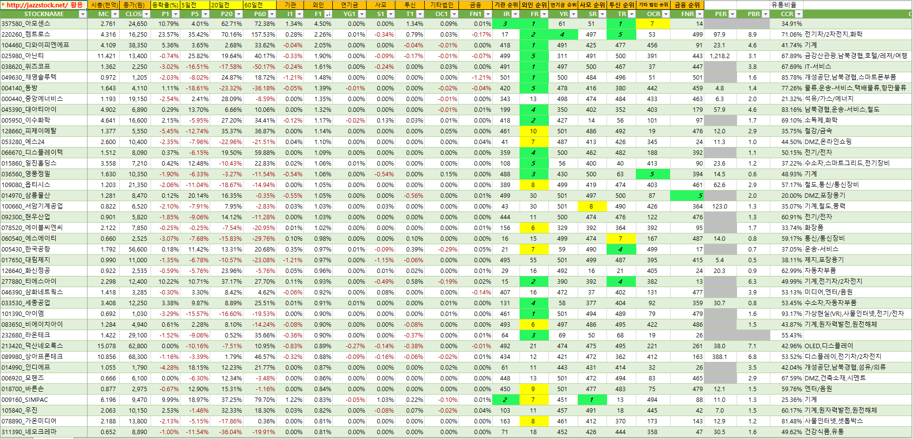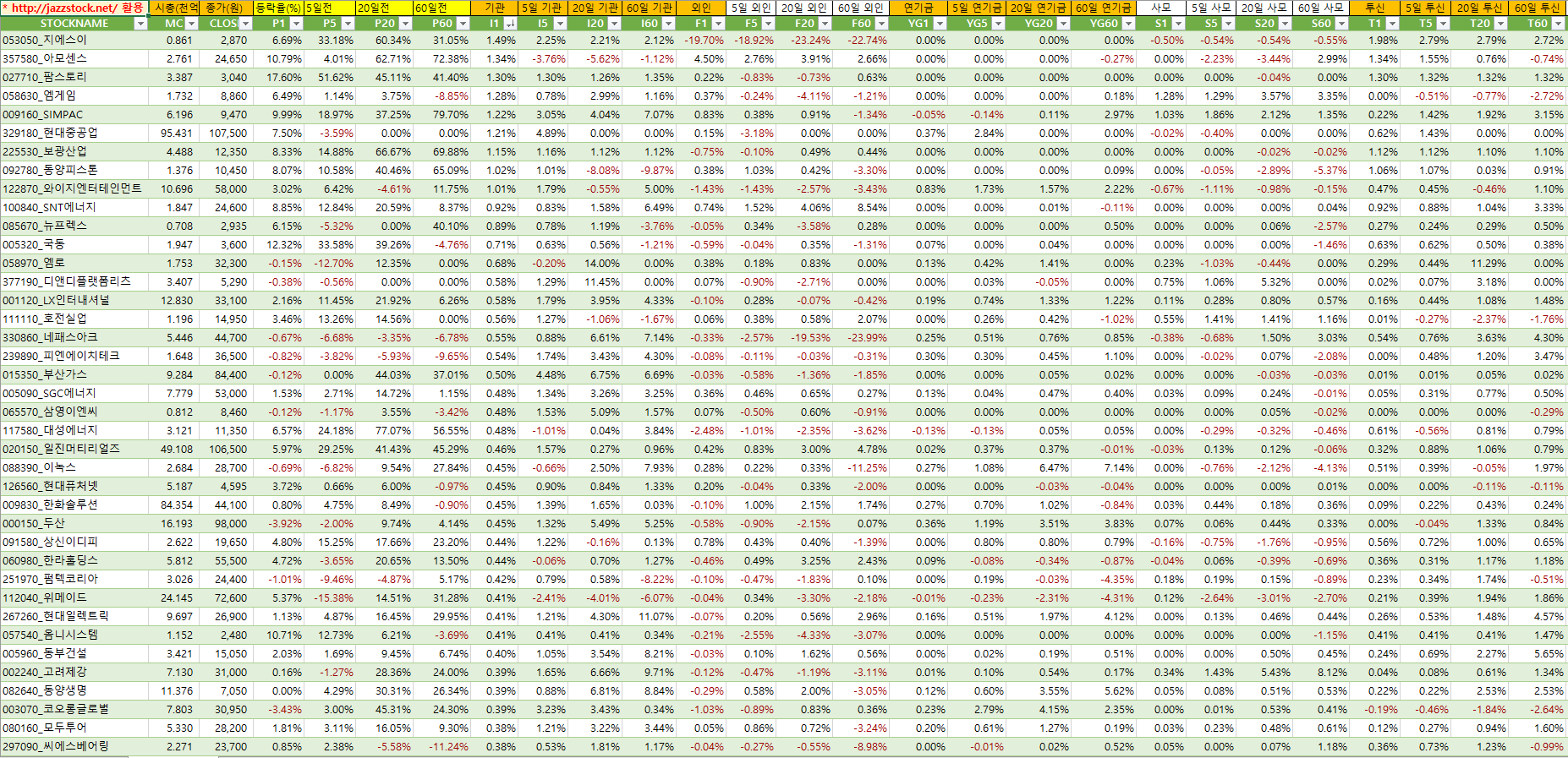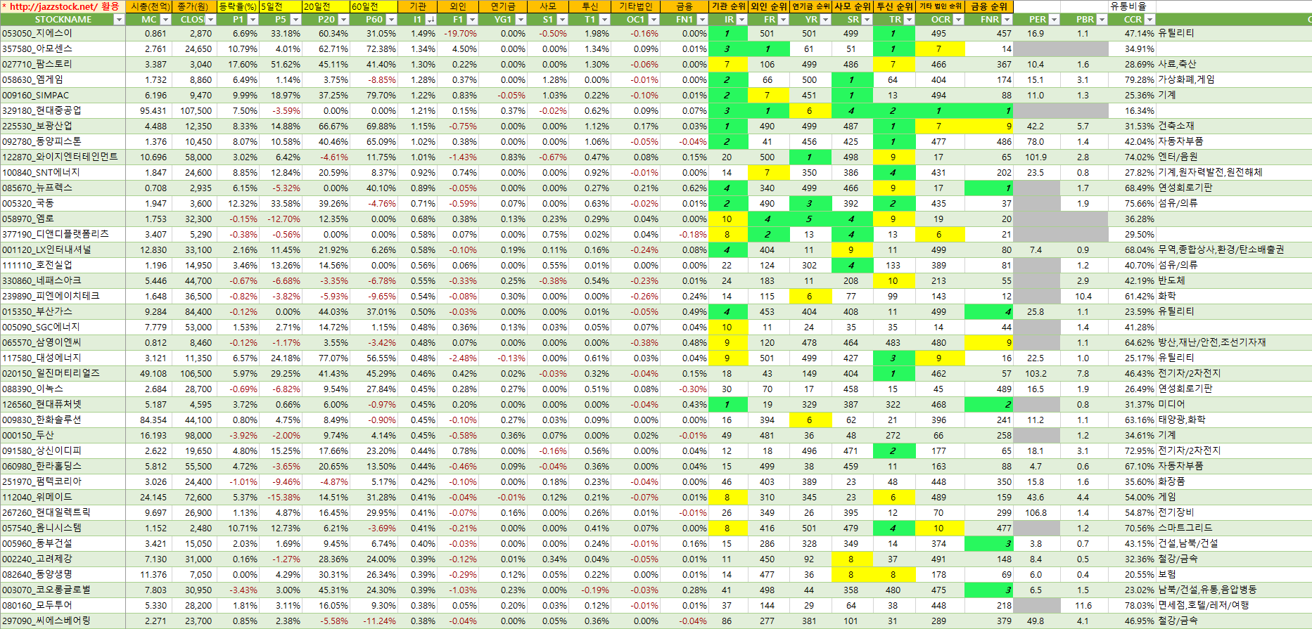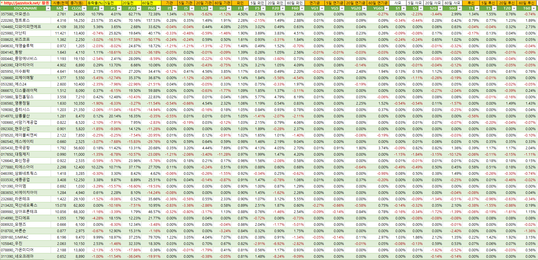 아래 자료는 재즈스탁의 데이터를 활용하여 장마감후 당일 시가총액대비 기관매수세가 큰 종목 순서로 작성하였습니다.