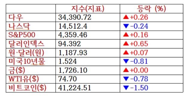이날 뉴욕증권거래소(NYSE)에서 다우존스30산업평균지수는 전장보다 90.73포인트(0.26%) 오른 34,390.72로, 스탠더드앤드푸어스(S&P)500지수도 전장보다 6.83포인트(0.16%) 상승한 4,359.46으로 마감했다. 반면 나스닥지수는 전장보다 34.24포인트(0.24%) 하락한 14,512.44를 기록했다.