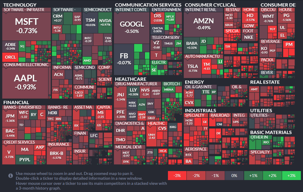 대형기술주들도 약세를 면치 못하며 애플이 0.93% 떨어지는 등 아마존 마이크로소프트 알파벳도 1% 미만의 약세를 기록했다. 이외 페이스북, 0.06 아마존, 페이스북, 구글도 각각 0.49%, 0.06%, 0.50% 하락세를 기록했다.