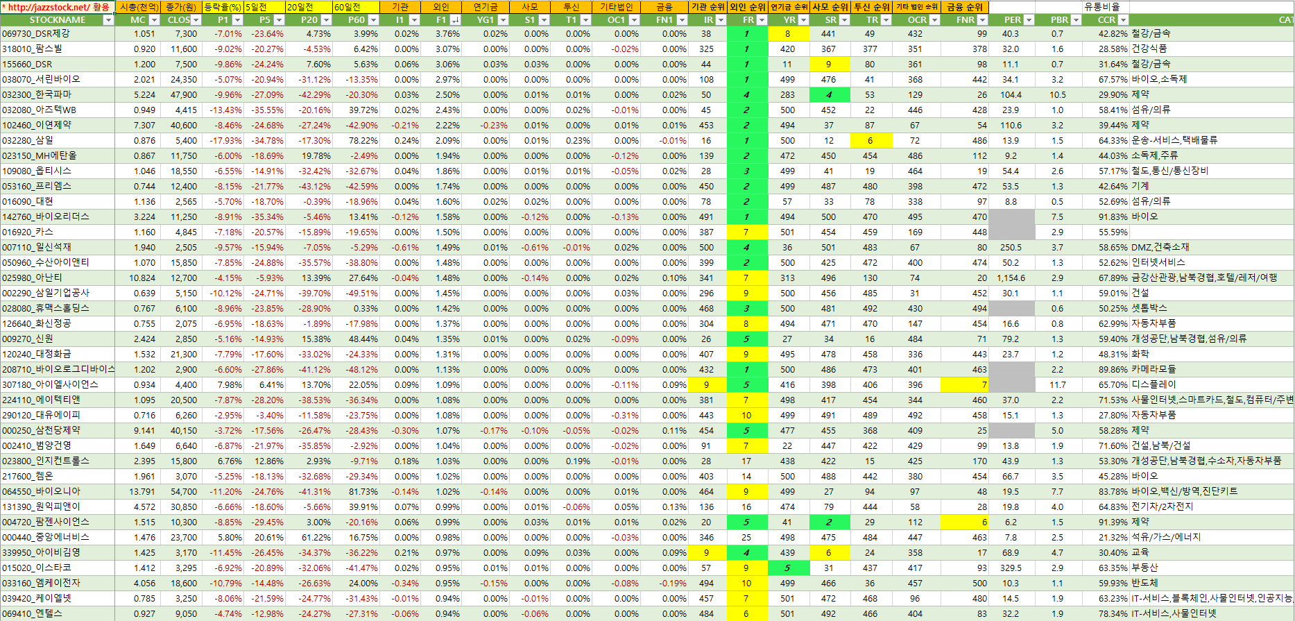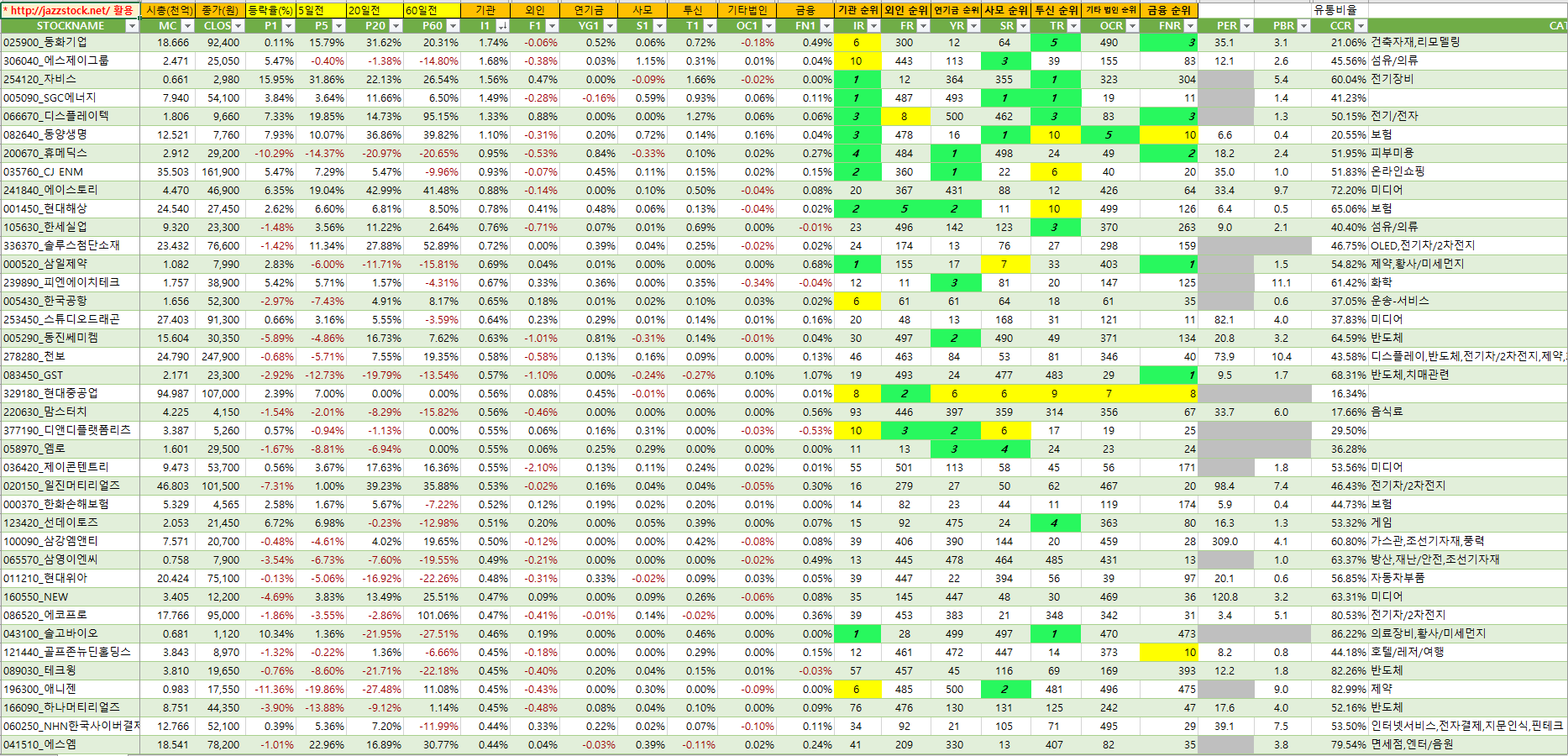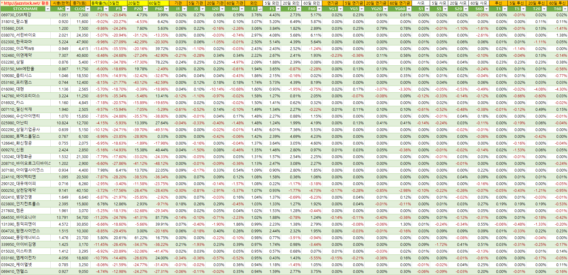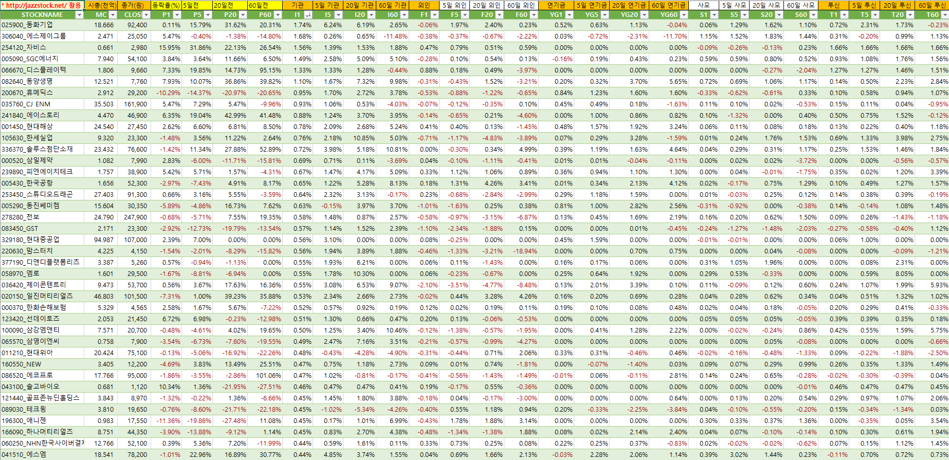 아래 자료는 재즈스탁의 데이터를 활용하여 장마감후 당일 시가총액대비 기관매수세가 큰 종목 순서로 작성하였습니다.