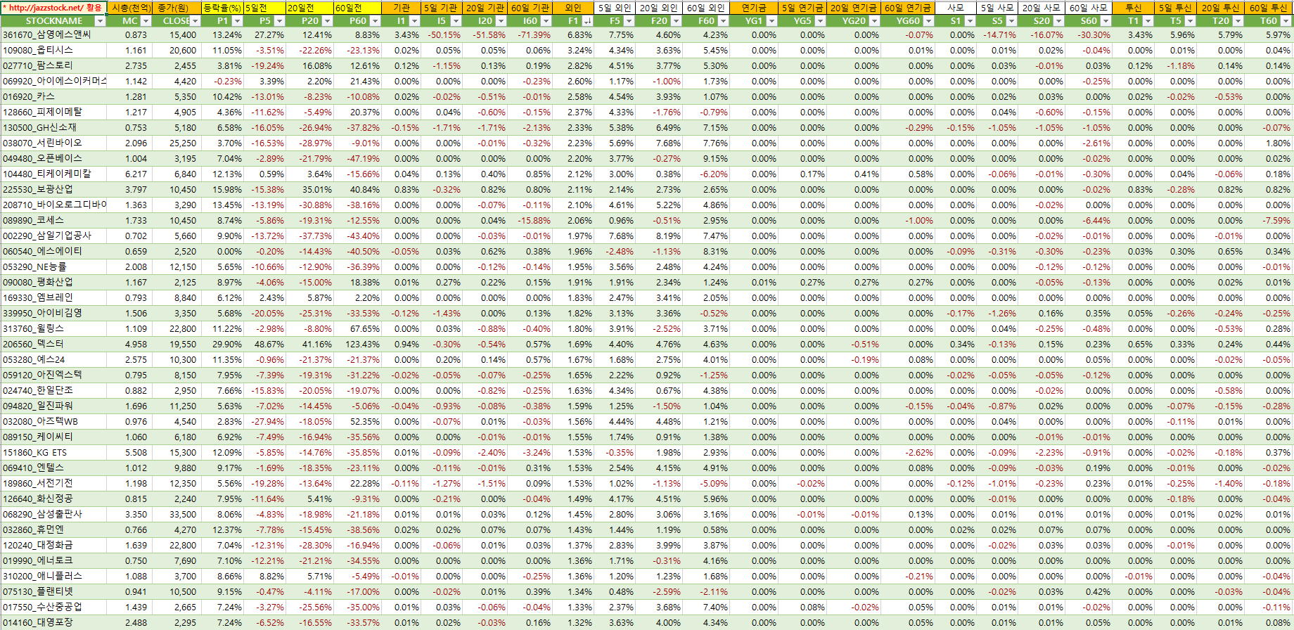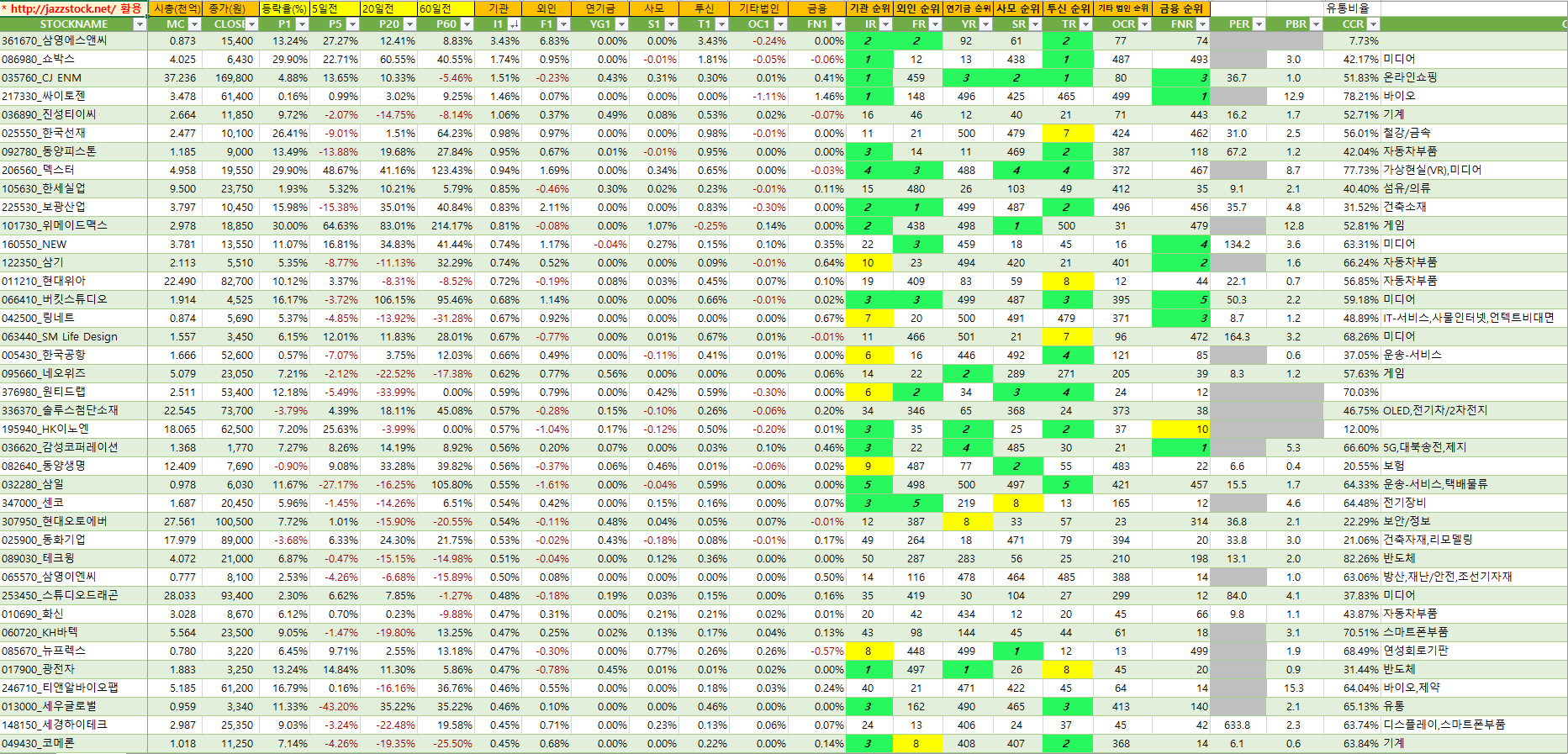 아래 자료는 재즈스탁의 데이터를 활용하여 장마감후 당일 시가총액대비 기관매수세가 큰 종목 순서로 작성하였습니다.