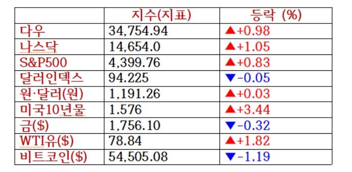 | 지수 | 종가 | 등락폭 | 등락률 | 상승/하락/보합 |