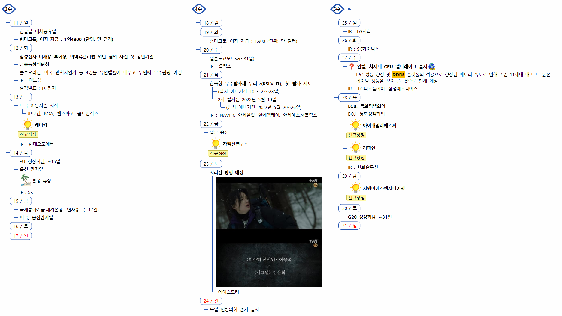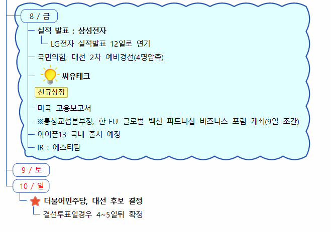 1) 증시캘린더는 개인적으로 관련된 소식을 확인후 작성한 일정이라 변동 또는 오류의 소지가 있습니다.