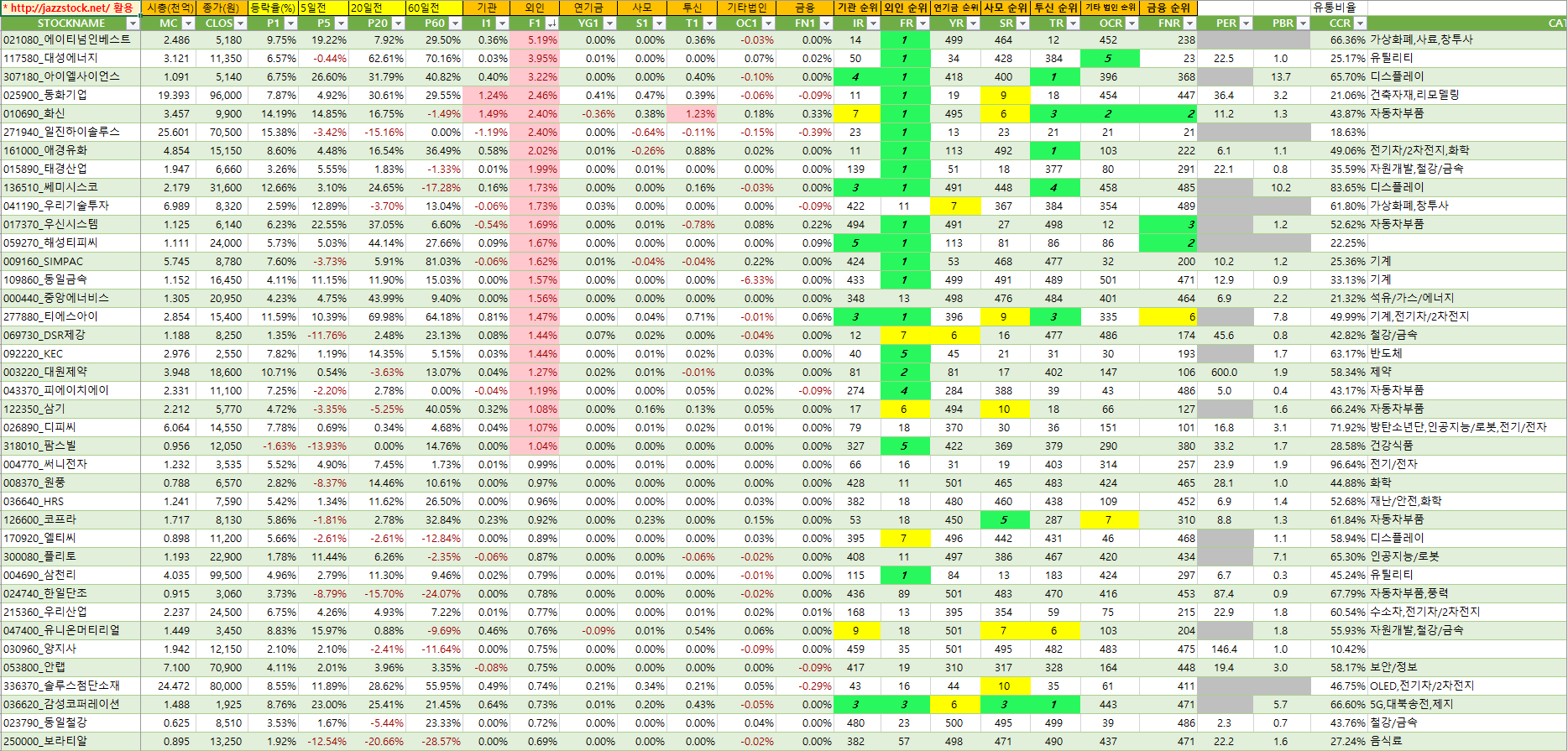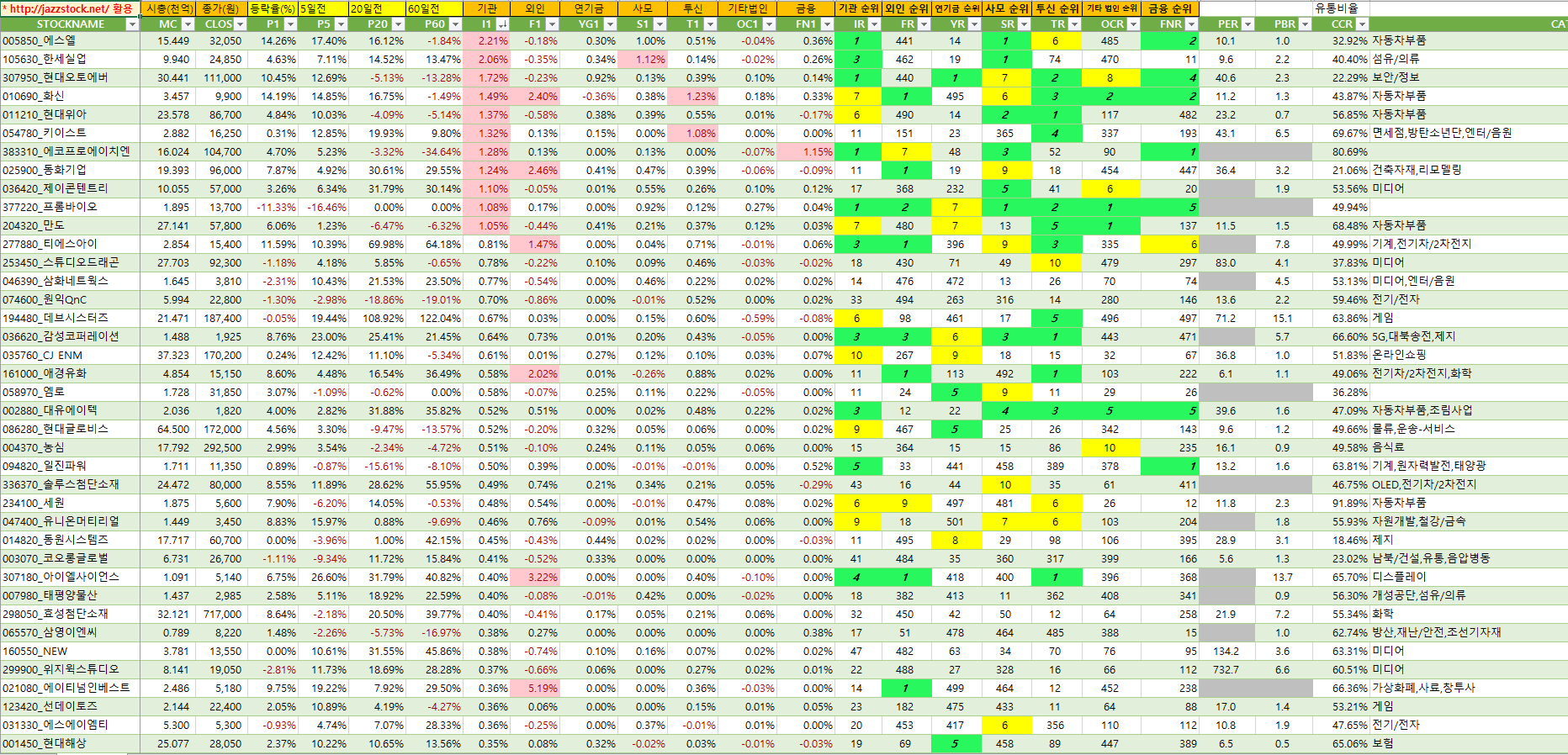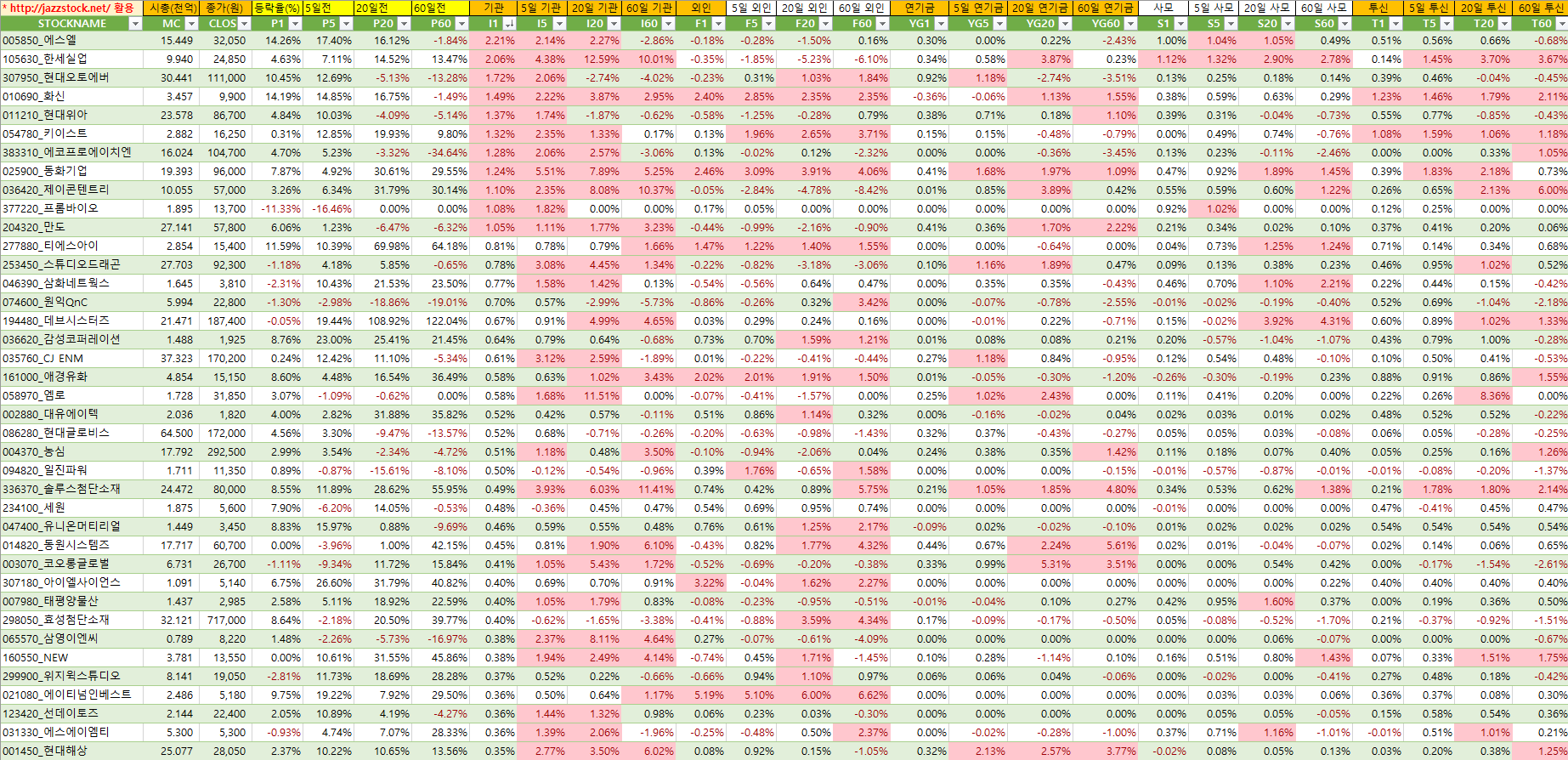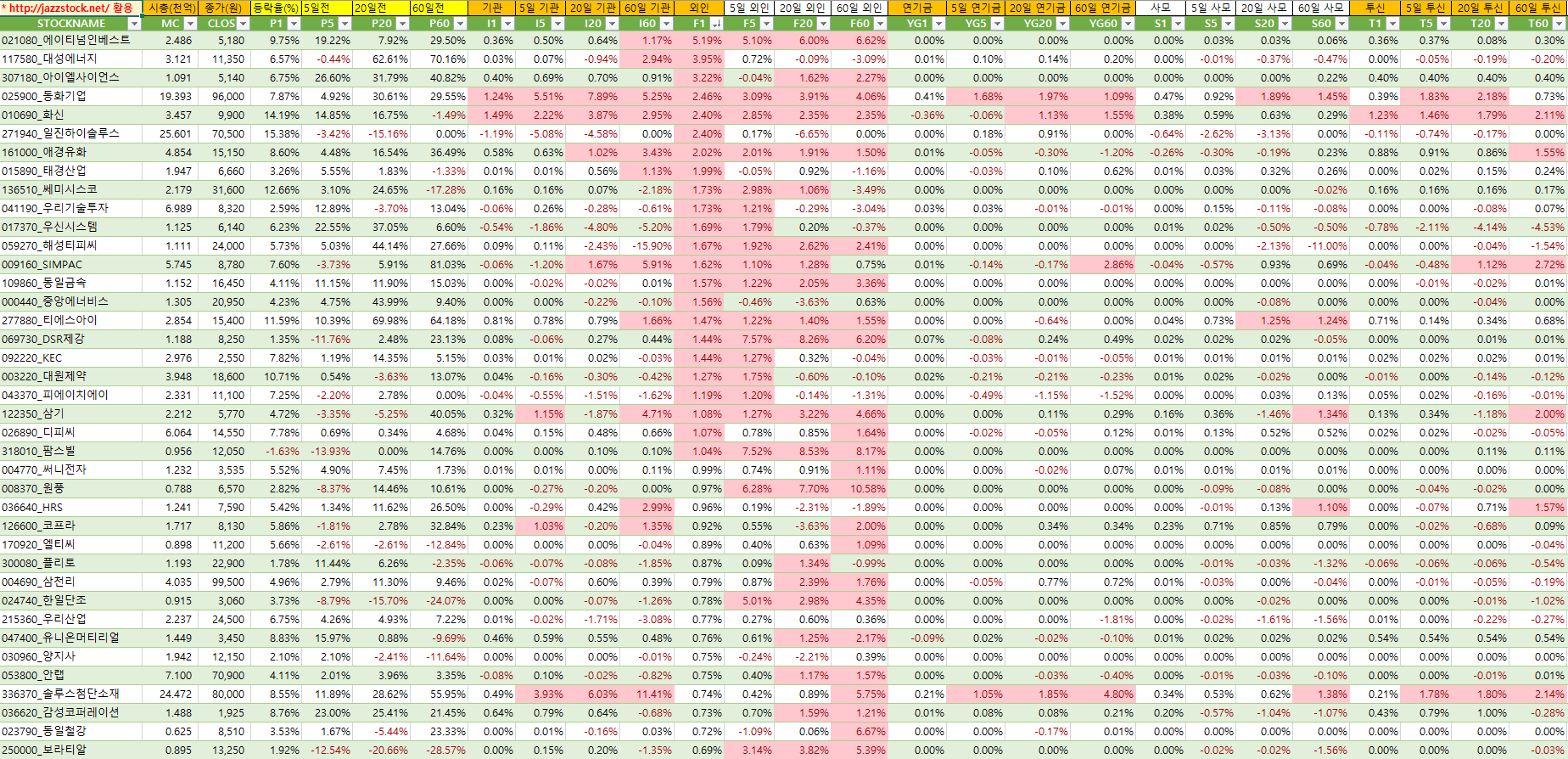 아래 자료는 재즈스탁의 데이터를 활용하여 장마감후 당일 시가총액대비 기관매수세가 큰 종목 순서로 작성하였습니다.