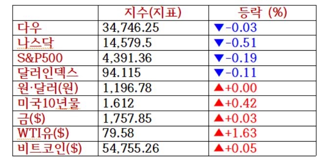 | 지수 | 종가 | 등락폭 | 등락률 | 상승/하락/보합 |