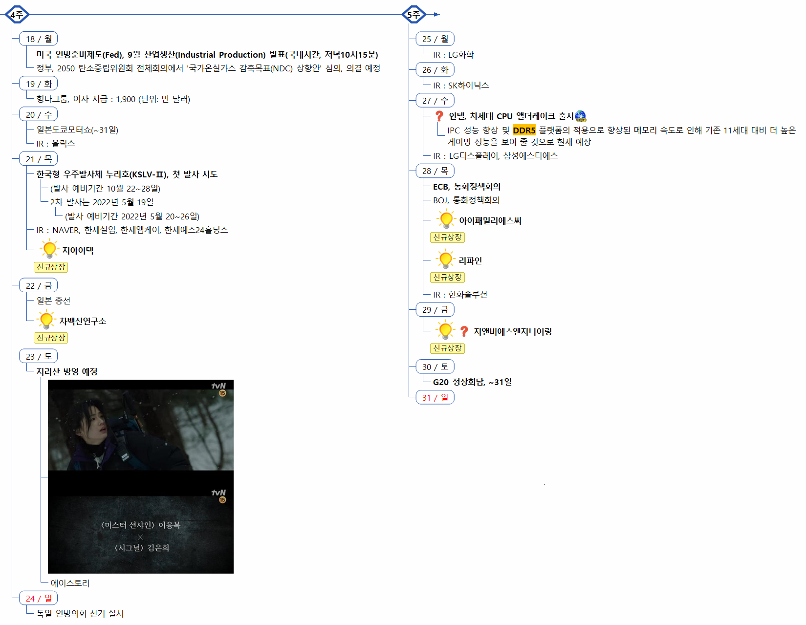 - 금주일정 : 미국 물가지표 발표 (13일(수) CPI, 14일(목) PPI 예정) // 13일(수) 9월 FOMC 의사록 // 미국 은행주 실적발표 (JP모건, BoA, 시티, 웰스파고 등)
