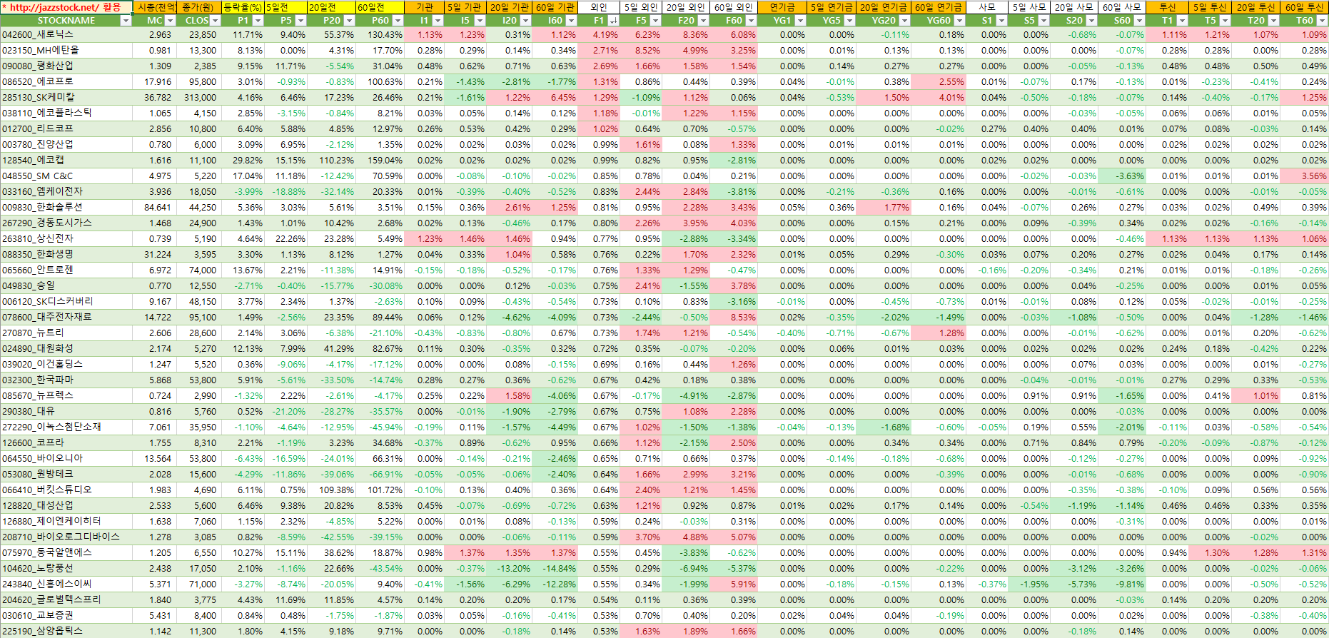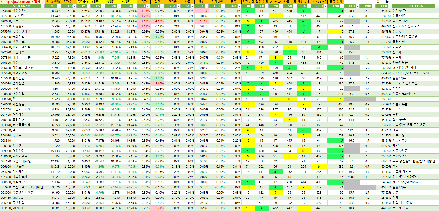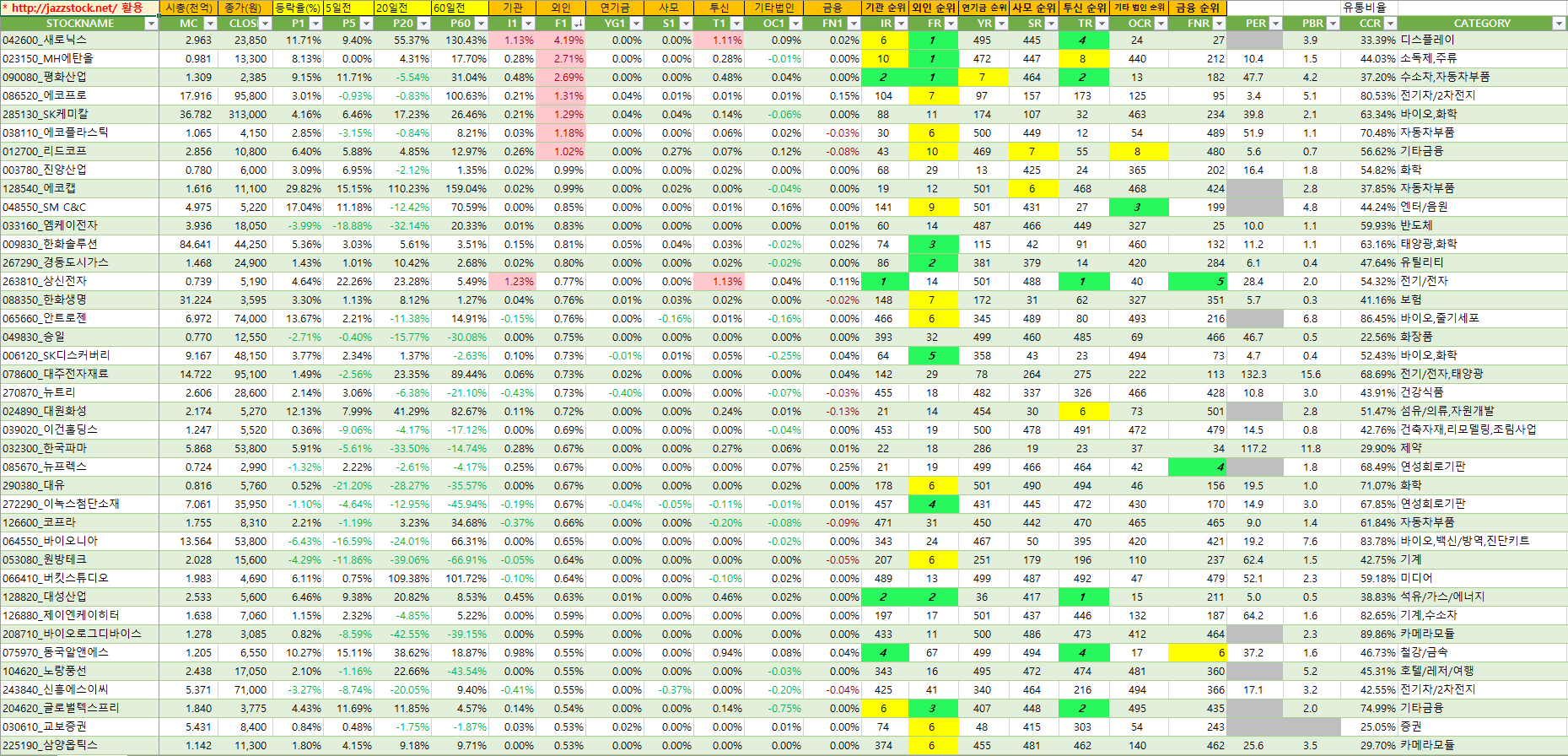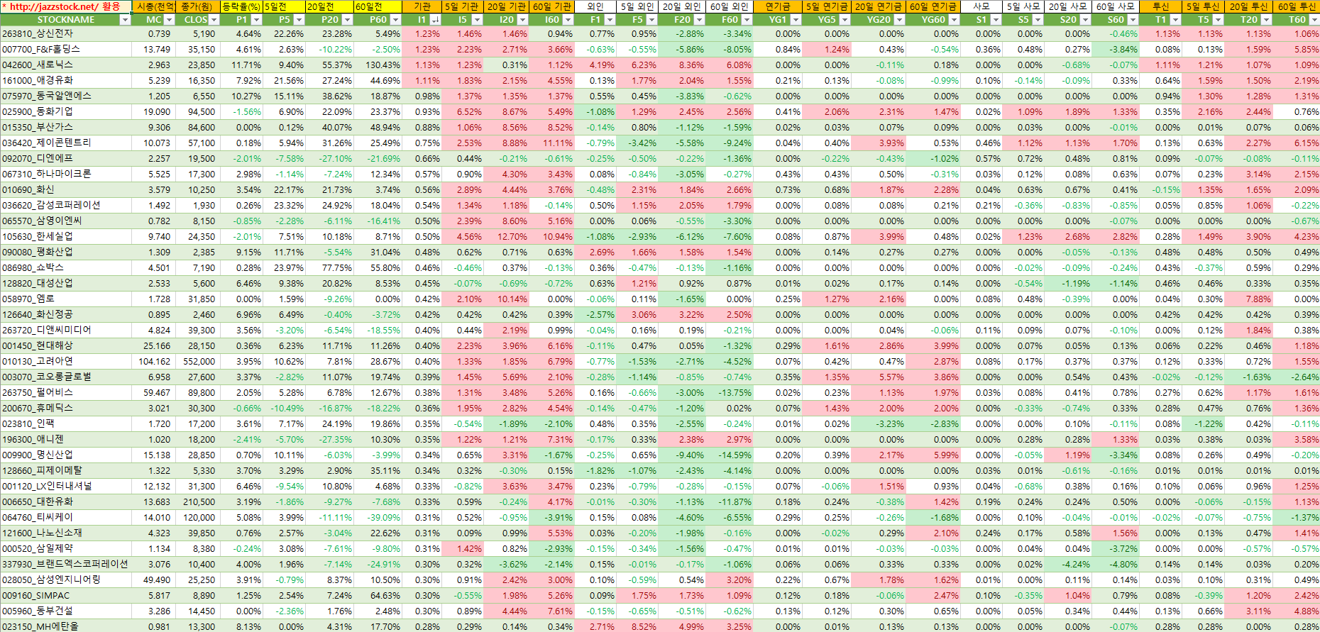 아래 자료는 재즈스탁의 데이터를 활용하여 장마감후 당일 시가총액대비 기관매수세가 큰 종목 순서로 작성하였습니다.