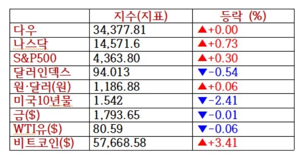 반면 반도체 부족으로 새로운 스마트폰 모델인 아이폰13을 감산할 가능성이 있다는 보도가 나온 애플은 약세를 보였고 페이스북도 하락했다.