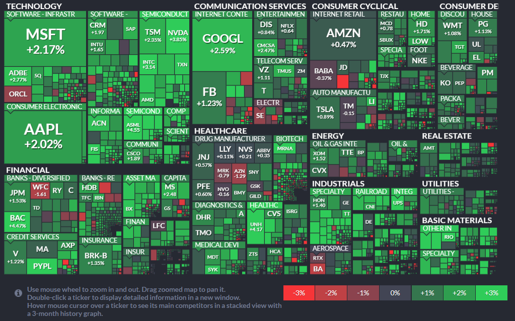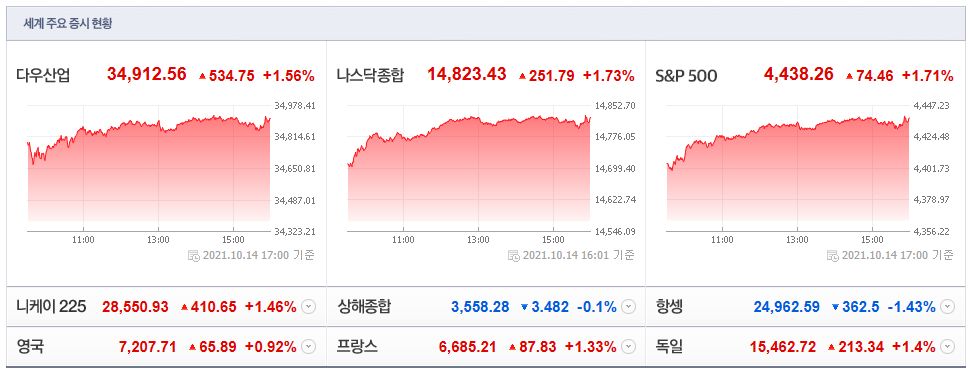 다우 지수는 전 거래일보다 1.56% 상승한 34,912.56에 거래를 마쳤다. S&P500지수는 1.71% 오른 4,438.26을, 기술주 중심의 나스닥 지수는 1.73% 상승한 14,823.43에 장을 마감했다.