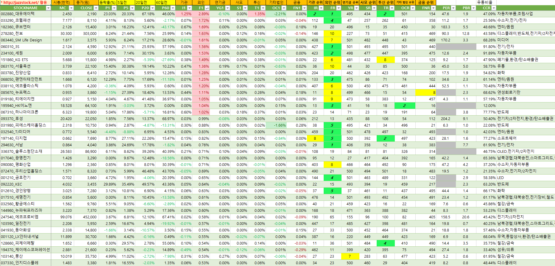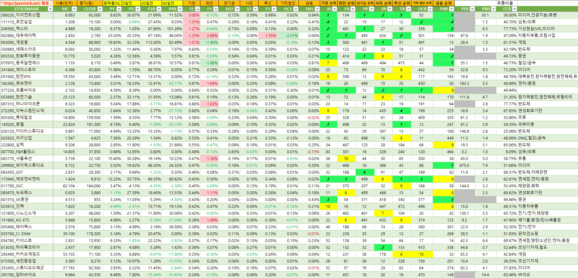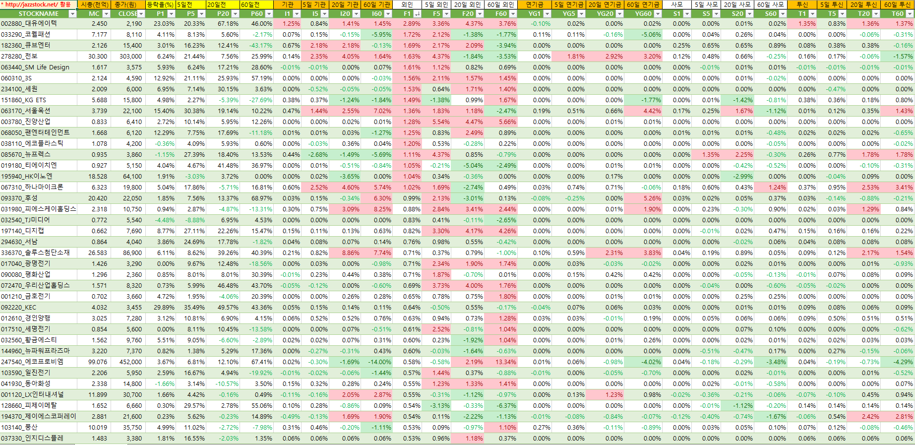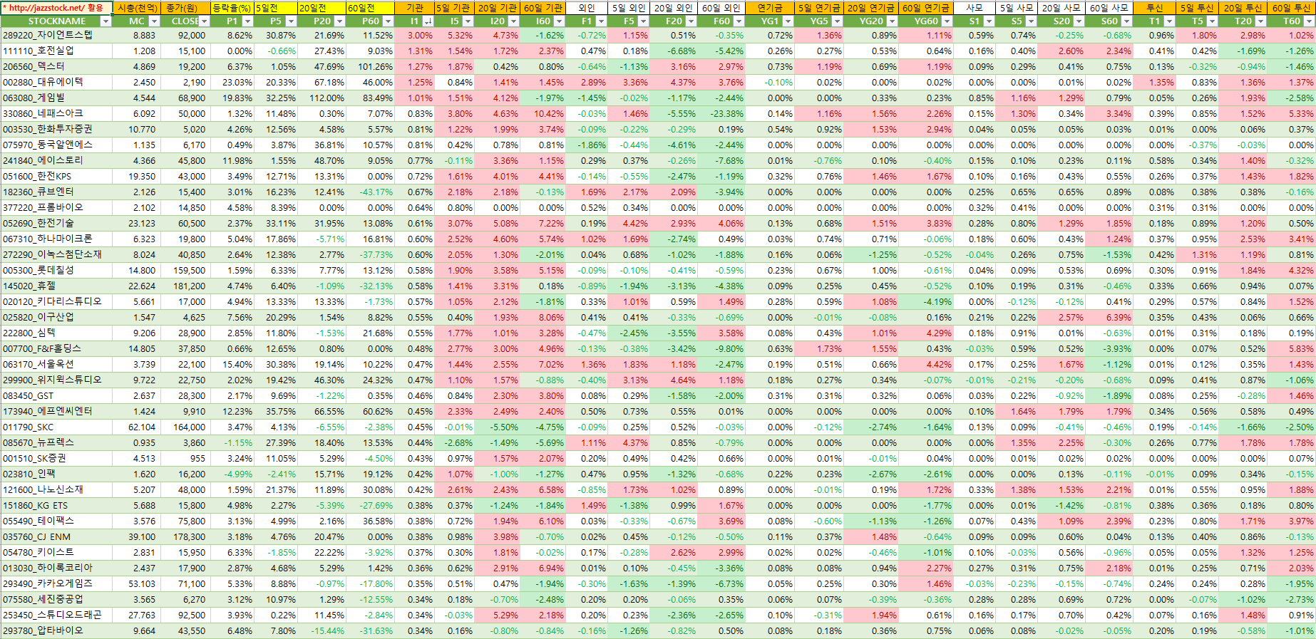 아래 자료는 재즈스탁의 데이터를 활용하여 장마감후 당일 시가총액대비 기관매수세가 큰 종목 순서로 작성하였습니다.