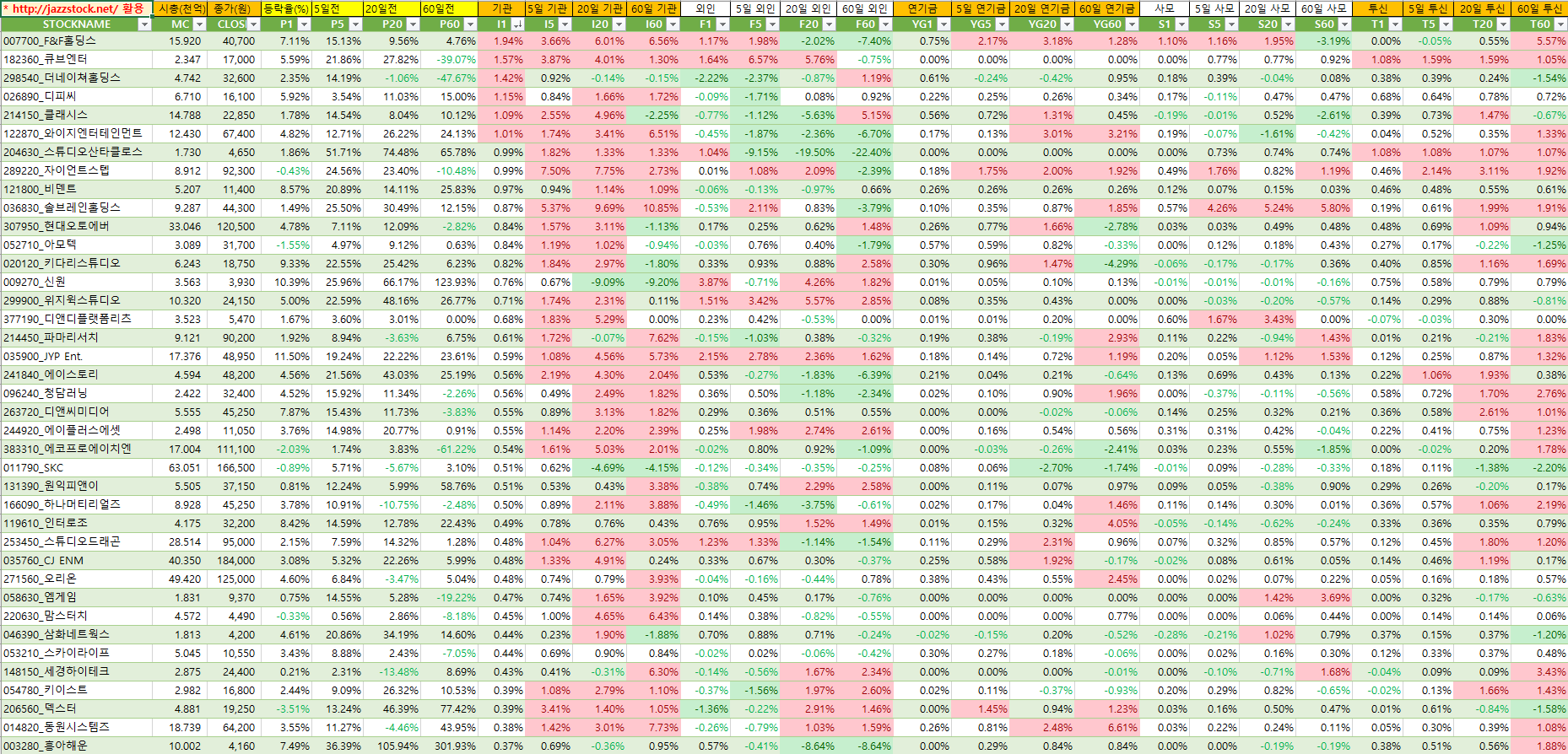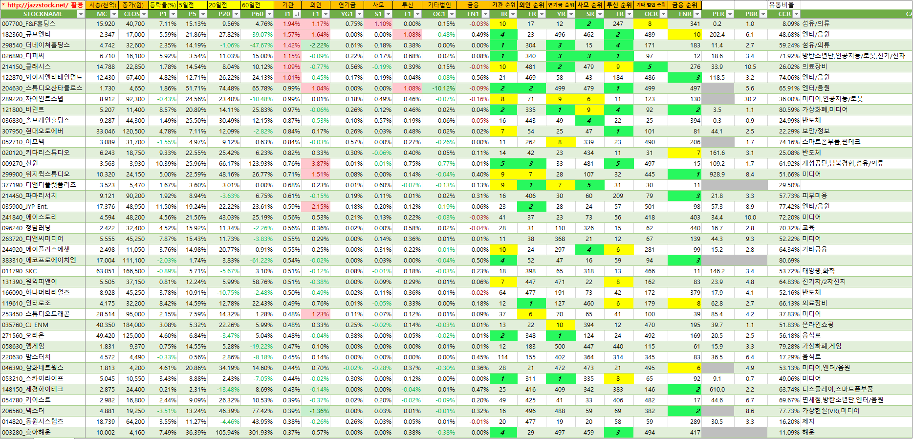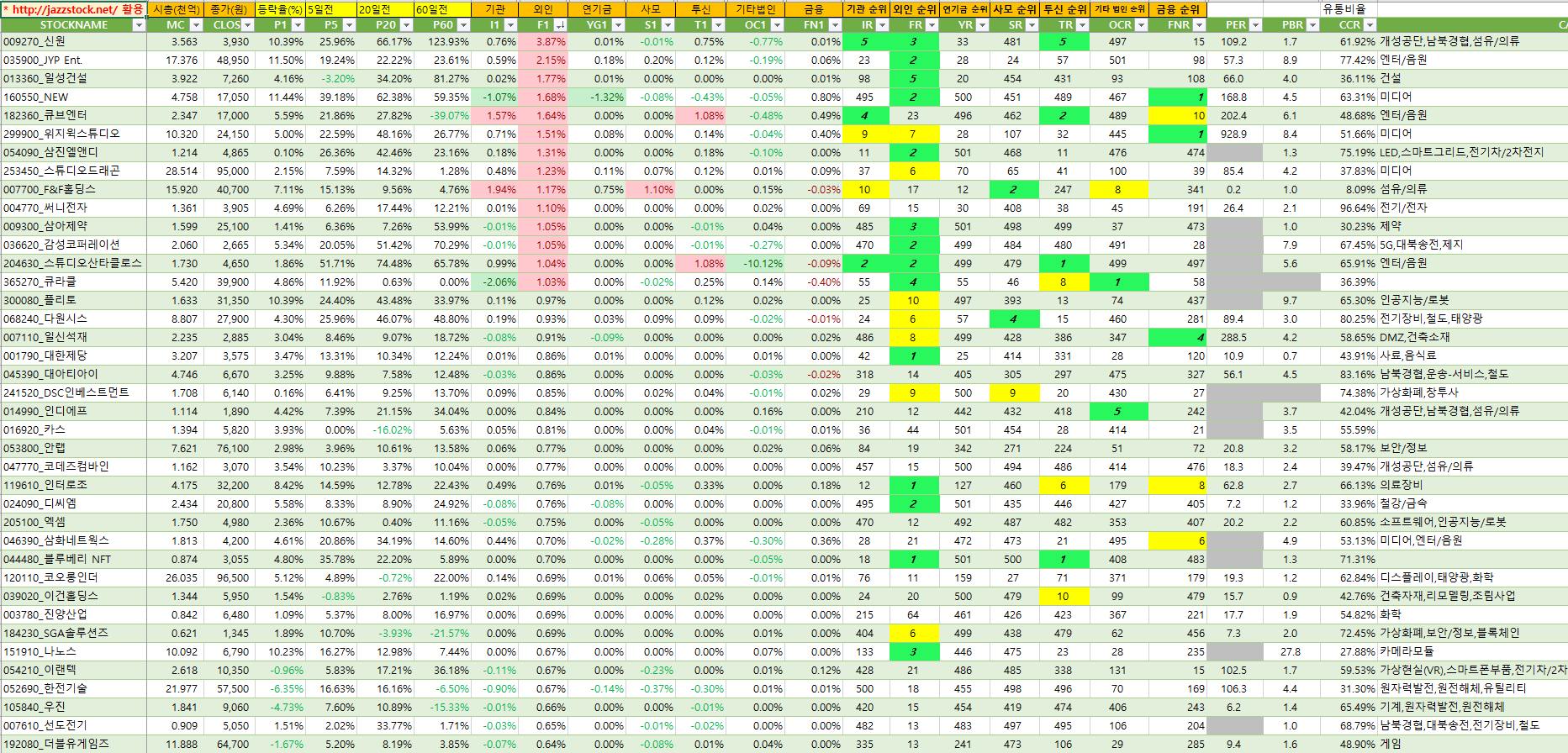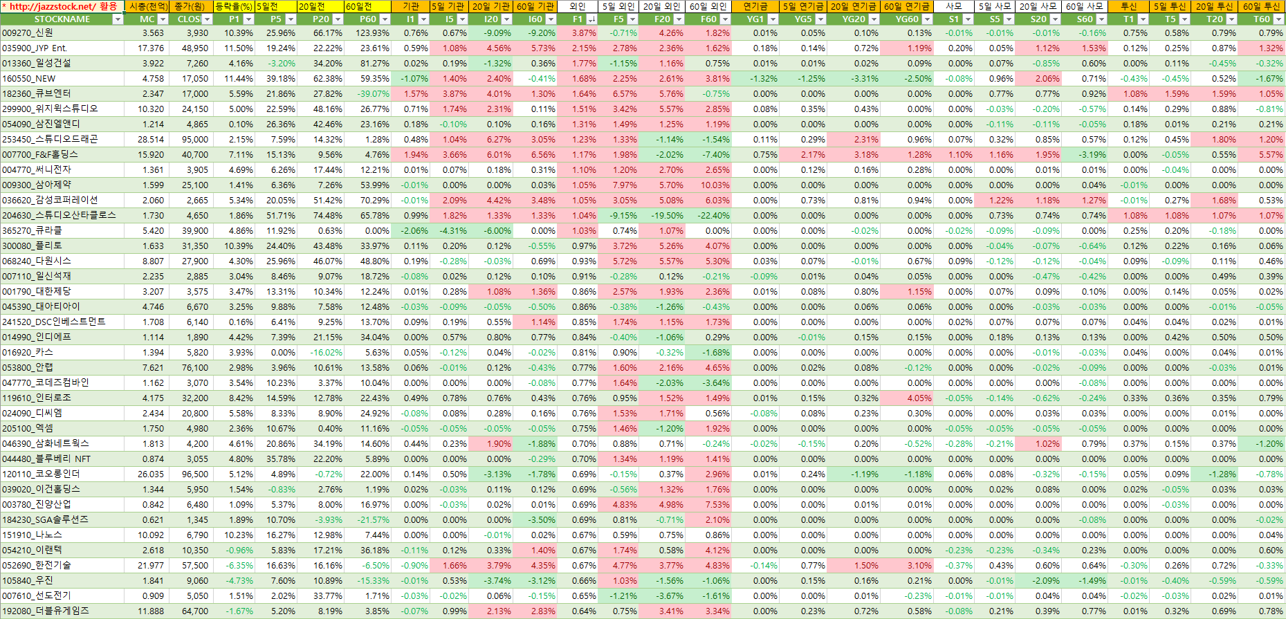 아래 자료는 재즈스탁의 데이터를 활용하여 장마감후 당일 시가총액대비 기관매수세가 큰 종목 순서로 작성하였습니다.