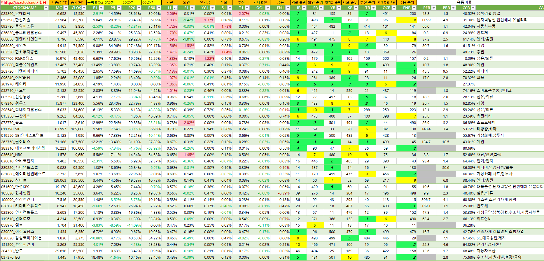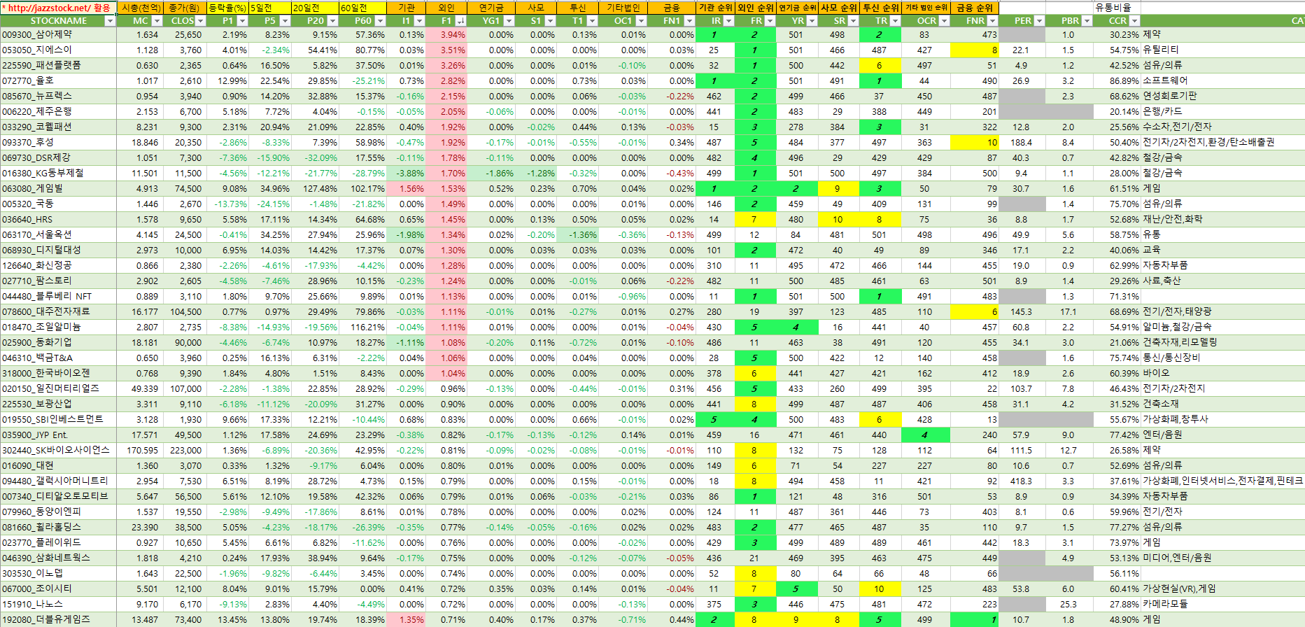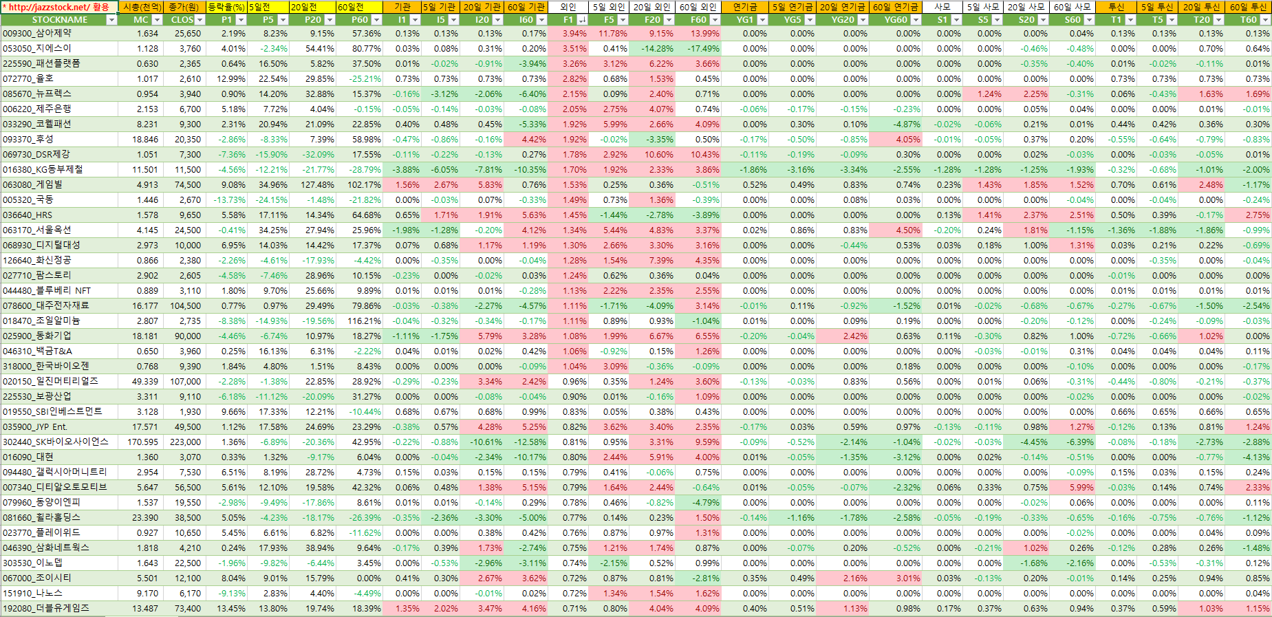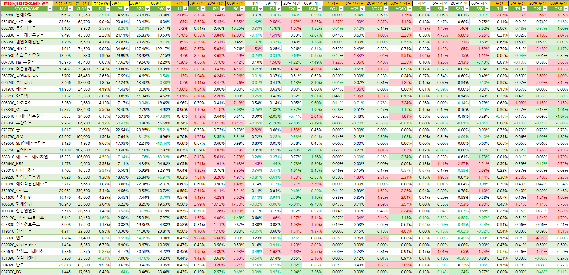 아래 자료는 재즈스탁의 데이터를 활용하여 장마감후 당일 시가총액대비 기관매수세가 큰 종목 순서로 작성하였습니다.
