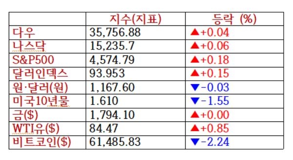 | 지수 | 종가 | 등락폭 | 등락률 | 상승/하락/보합 |