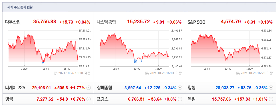 26일(이하 미 동부시각) 뉴욕증권거래소(NYSE)에서 다우지수는 전일대비 15.73포인트(0.04%) 오른 3만5756.88로 거래를 마감했다. S&P500 지수는 전일대비 8.31포인트(0.18%) 오른 4574.79로 거래를 마감했고, 기술주 중심의 나스닥 지수는 전일대비 9.01포인트(0.06%) 오른 1만5235.71로 거래를 마쳤다. 다우지수는 3거래일 연속, S&P500지수는 이틀 연속 사상 최고치 행진이다.
