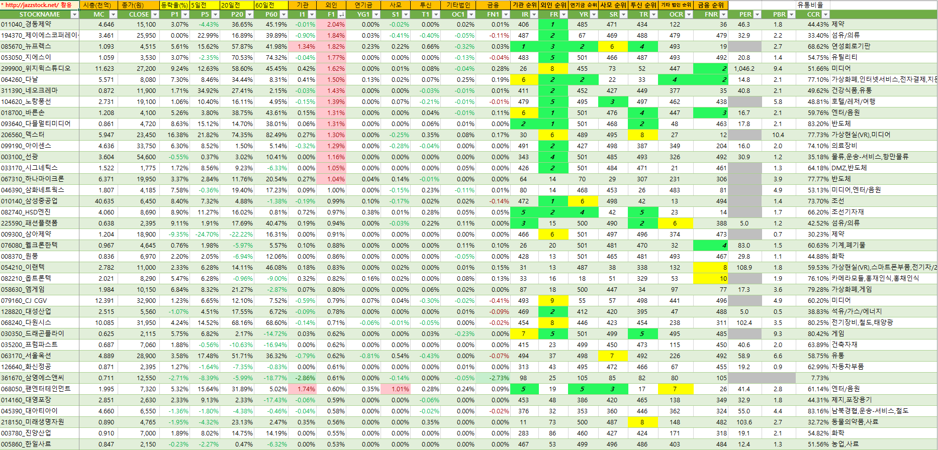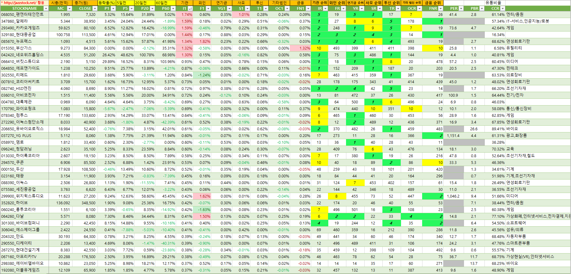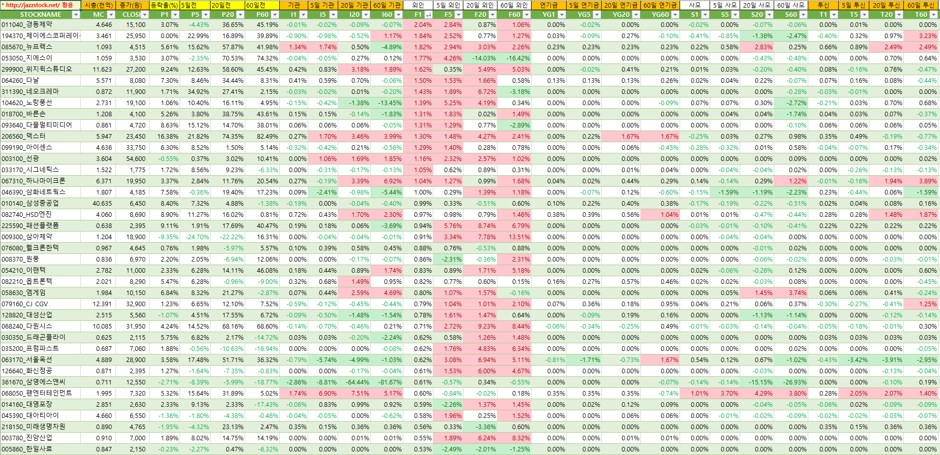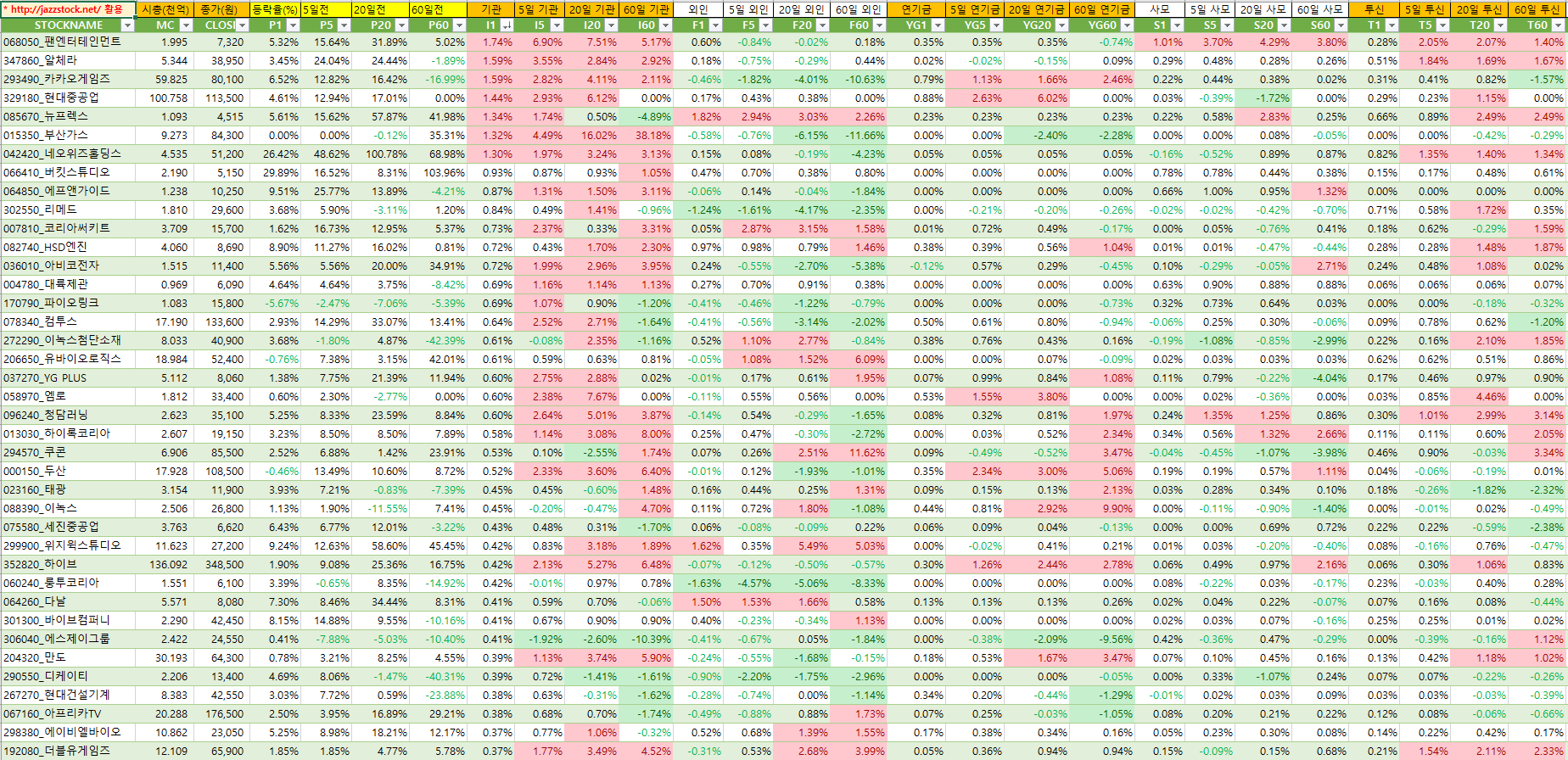 아래 자료는 재즈스탁의 데이터를 활용하여 장마감후 당일 시가총액대비 기관매수세가 큰 종목 순서로 작성하였습니다.
