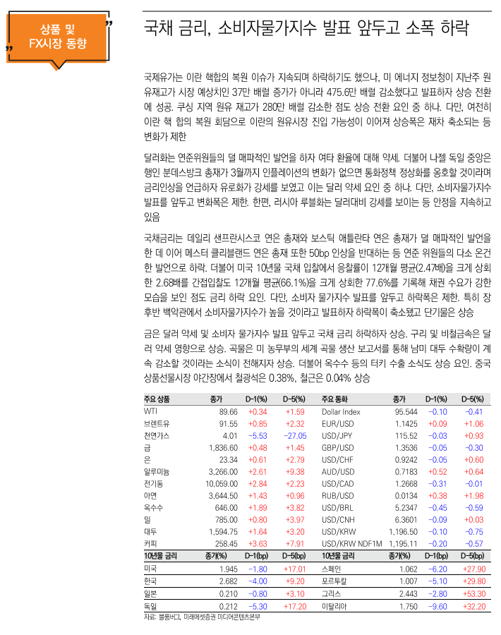 뉴욕증시는 10년물 국채 금리가 다소 안정되며 저가 매수세가 유입됨에 따라 상승 마감. 또한 기업의 견조한 실적과 우크라이나의 지정학적 리스크가 완화되며 주가 상승 압력을 지지. 다만, 시장은 미국 연방준비제도(Fed)의 긴축 행보와 내일 발표될 미국 소비자물가지수(CPI)의 발표를 주시. 애틀랜타 연방준비은행의 라파엘 보스틱 총재는 올해 3회의 금리 인상을 예상 한다면서도 금리 인상 후 시장의 반응을 예의주시해야 한다고 강조. 또한 이번 기준금리 인상을 25bp 예상하고 있지만, 미연방준비제도(Fed)는 기준금리 50bp 인상을 포함한 모든 가능성을 염두에 두고 있음을 언급. 개별 기업으로 미국의 패스트푸드 체인 업체 치포틀레 멕시칸 그릴(CMG/+10.2%)은 시장 예상치를 상회하는 순이익을 발표하며 주가는 10% 가량 급상승한 1,608.7달러에 마감