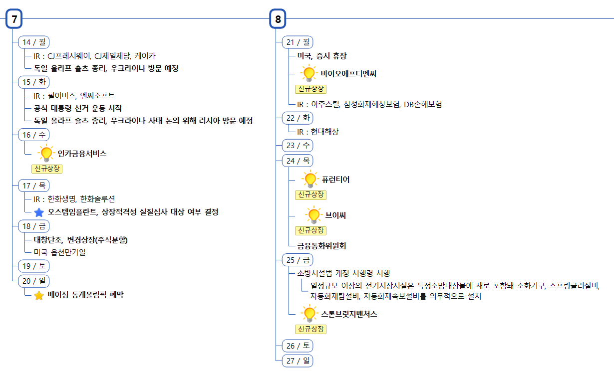 1) 증시캘린더는 개인적으로 관련된 소식을 확인후 작성한 일정이라 변동 또는 오류의 소지가 있습니다.