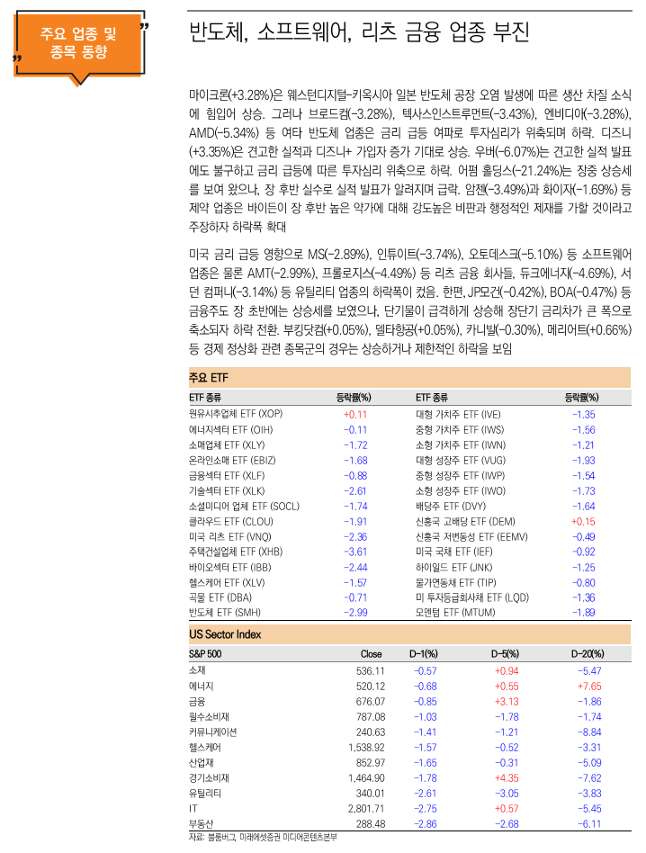 섹터별 ETF는 미연방준비제도(Fed)의 기준금리인상에 따른 투자 심리가 악화 되며, 필수소비재(XLP/-1.1%)ETF와 커뮤니케이션(XLC/-1.5%) ETF를 포함한 대부분의 섹터가 하락 마감. 미국의 식료품 제조 업체 펩시코(PEP)는 시장 예상치를 상회하는매출을 기록했음에도 인플레이션에 따른 원자재 비용과 광고 마케팅 비용이 상승하며 주가는 2.1% 하락, 필수소비재(XLP) ETF의 하방 압력을 가중. 반면, 글로벌 미디어 기업 월트 디즈니(DIS)는 스트리밍 서비스인 디즈니 플러스의 구독자 수가 시장 예상치를 상회하는 1억 2980만명을 기록하며 매출 상승 기인. 이에 주가는 3.4% 가량 상승하며 섹터 상승을 지지 했지만, 미국 통신 기업 루멘 테크놀로지스(LUMN/-15.6%)를 포함한대부분의 기업들이 약세를 시현하며 커뮤니케이션(XLC)는 하락 마감.