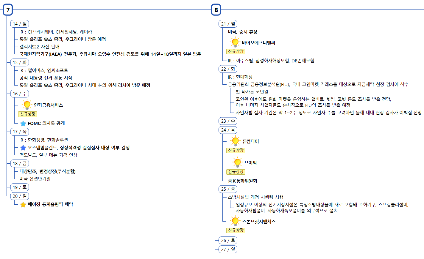 1) 증시캘린더는 개인적으로 관련된 소식을 확인후 작성한 일정이라 변동 또는 오류의 소지가 있습니다.