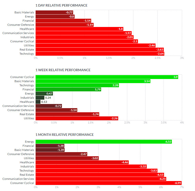 업종별로 살펴보면 기술주 외에도 임의소비재, 부동산, 유틸리티, 통신 관련주는 하락했고 자재, 에너지, 금융 관련주는 올랐다.