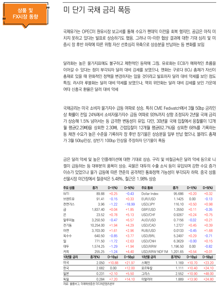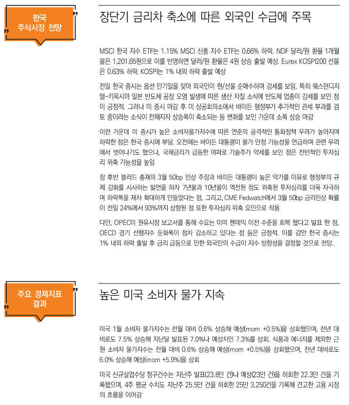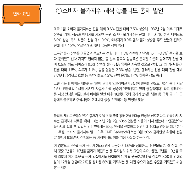(1) 미 1월 인플레가 1982년 이후 최고를 기록하며 장단기 금리차가 14bp 축소됐습니다.