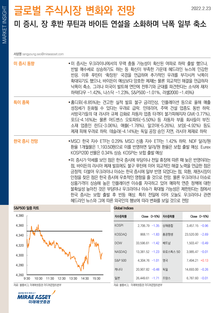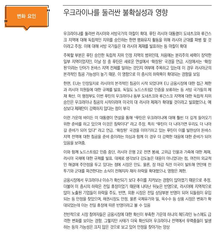 금일 뉴욕증시는 푸틴 러시아 대통령이 친러시아 반군이 세운 도네츠크인민공화국(DPR)과 루간스크인민공화국(LPR)의 독립을 승인하면서 우크라이나와의 긴장감이 더욱 고조된 가운데 하락 마감. 푸틴 러시아 대통령은 승인과 동시에 러시아군의 진입을 명령함으로써 전면전 우려 상승. 지난 24시간 이내 우크라이나 동부 지역에 친러 반군과의 교전이 발생하였으며, 사상자가 연이어 발생. 이날 바이든 대통령은 러시아가 우크라이나에 대한 침공이 시작되었다고 발표하며, 이에 러시아 주요 은행 등 금융 거래를 차단함으로써 대응할 것이라고 발표. 이어 러시아의 국채에 대한 포괄적인 제재를 시행할 것이라고 언급. 이유로는 서방의 자금 조달에서 러시아 정부를 차단하는 것을 의미하며, 서구로부터 자금 조달 및 미국과 유럽 시장에서 새로운 부채 거래를 할 수 없게 하기 위함이라고 덧붙여 설명. 금일 승인은 러시아가 군대를 철수하지 않을 것임을 인정한 것이므로, 유럽에 이미 주둔한 미군과 장비에 추가적인 지원을 승인할 것으로 언급.