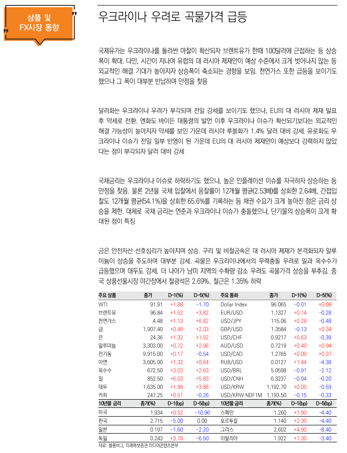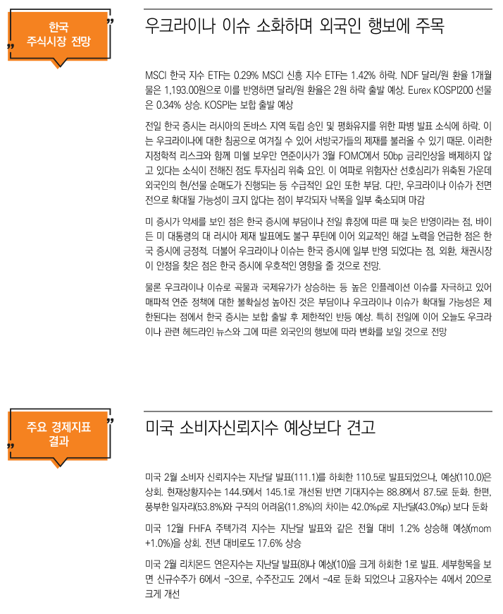 시장은 향후 관련 뉴스에 영향은 받겠으나 무력 충돌이 이어지지 않는 한 시간이 지날 수록 우크라이나 사태에 면역력이 높아질 것이고 본질적인 문제로 돌아오게 될 것입니다.