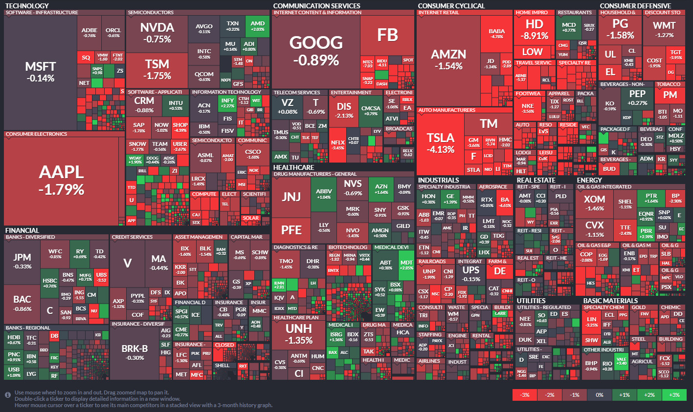 금일 섹터별 ETF로는 유틸리티(XLU/-0.1%), 부동산(VNQ/-0.4%), 소재(XLB/-1.4%), 에너지(XLE/-1.7%), 자유소비재(XLY/-2.9%) 등 일제히 모든 섹터 하락 마감. 홈디포(HD/-8.9%)는 금일 애널리스트의 예상치를 상회한 후 소폭 상승하였으나, 4분기 수익성은 공급망 이슈로 인한 비용 상승, 고객 거래가 감소, 판매 비용이 증가하였다는 분석에 하락 마감. 이어 베스트바이(BBY/-7.3%)와 함께 자유소비재(XLY)섹터 하락 견인 마감.