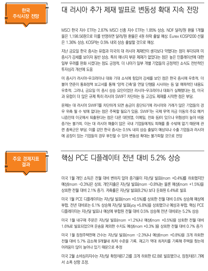 금일 뉴욕증시는 러시아가 우크라이나를 침공한 지 만 하루 만에 다시 대화할 준비가 되어있다고 발표 후 반등하며 상승 마감. 러시아는 우크라이나와 협상을 위해 벨라루스 민스크로 대표단을 보낼 준비가 되어있다고 발표 후 전쟁 공포가 다소 진정된 모습. 하지만, 이는 러시아가 우크라이나 수도 키예프 시내에서 교전을 시작했다는 보도가 나온 가운데 보도. 한편, 최근 인플레이션으로 인한 금리 인상 우려로 주가가 하락하는 가운데 투자자들은 우크라이나-러시아 간의 전쟁 우려도 감당하는 모습. 이날 발표된 경제지표로는 미국 연준(Fed)이 선호하는 물가 지표인 근원 개인소비지출(PCE) 가격지수가 5% 웃돌면서 긴축 재정정책은 더욱 시급한 것으로 판단. 개인소비지출은 전년 동기 대비 5.2% 상승하였으며, 월스트리트저널 애널리스트들이 집계한 예상치 보다 상회. 이에 3월에 기준금리를 인상할 것으로 예상되지만, 러시아와 우크라이나와의 전쟁으로 인상 기대는 다소 낮아진 것으로 분석.