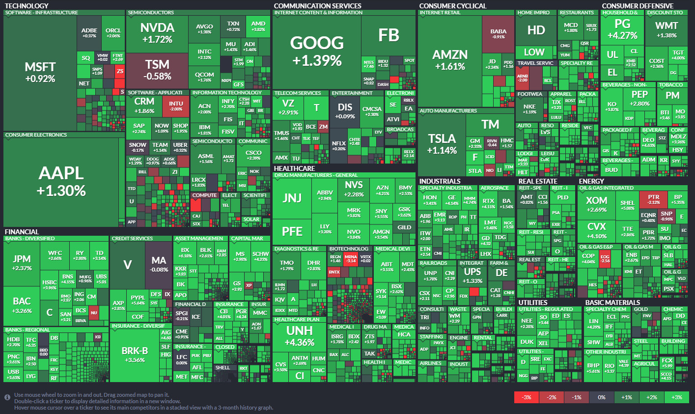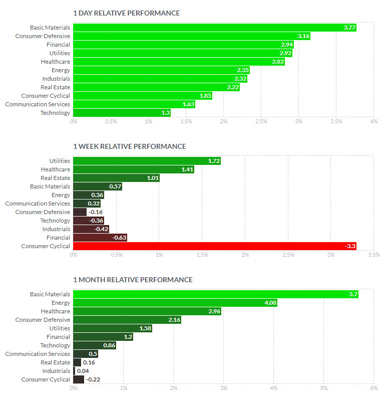 S&P500 지수 내 11개 업종이 모두 올랐다. 자재(소재), 금융, 유틸리티, 필수소비재, 헬스 관련주가 모두 3% 이상 올랐다. 에너지와 부동산, 산업 관련주도 2% 이상 뛰었다.