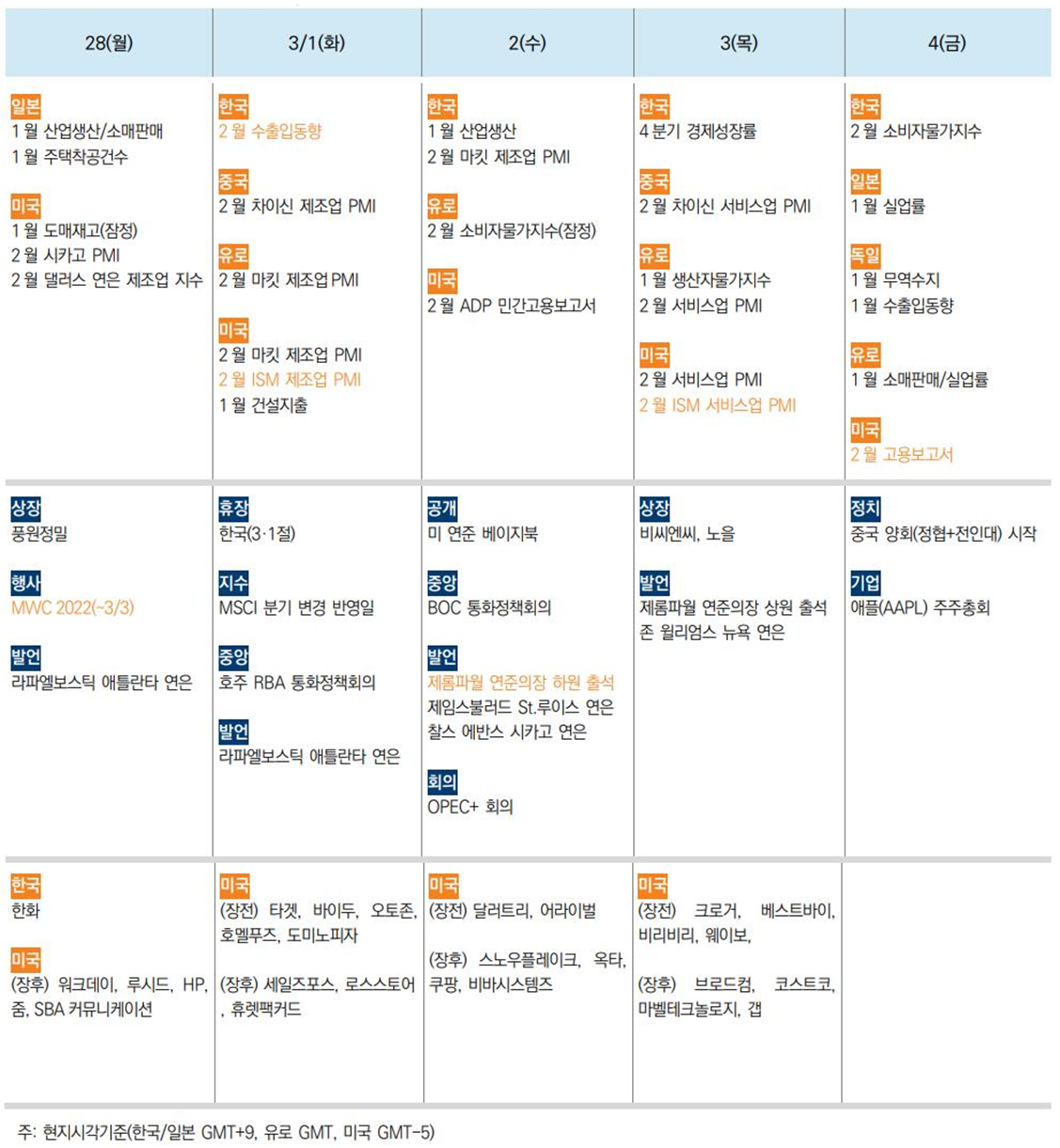 3월 1일(화) ~ 3월 2일(수) 증시캘린더 / 해외마감시황 (0) | 2022.03.02 |
