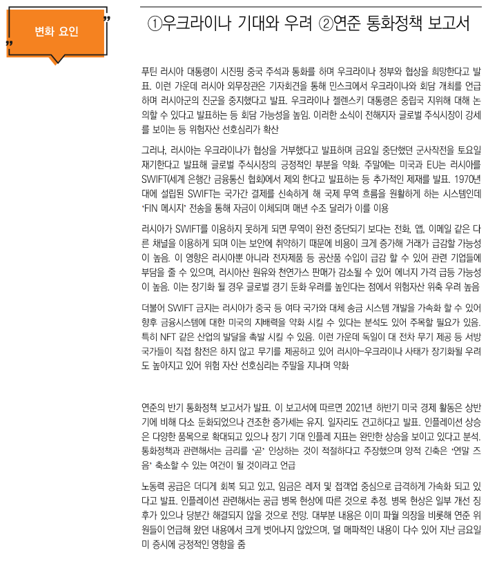 지난주 뉴욕증시는 인플레이션 압력과 지정학적 긴장 속 약세를 보이던 중 지난 25일 큰 폭의 반등을 보였다. 스탠더드앤드푸어스(S&P) 500은 2.2% 상승했고 지난 11월 고점 대비 최대 21%까지 하락했던 나스닥도 1.64% 오르며 전날의 3.34% 상승을 이어갔다. 러시아의 우크라이나 침공에도 불구하고 시장에서는 강력한 저점 매수 흐름이 포착된 것이다. 러시아의 우크라이나 침공이 계속되는 가운데 변동성은 이번주도 이어질 것으로 보인다.