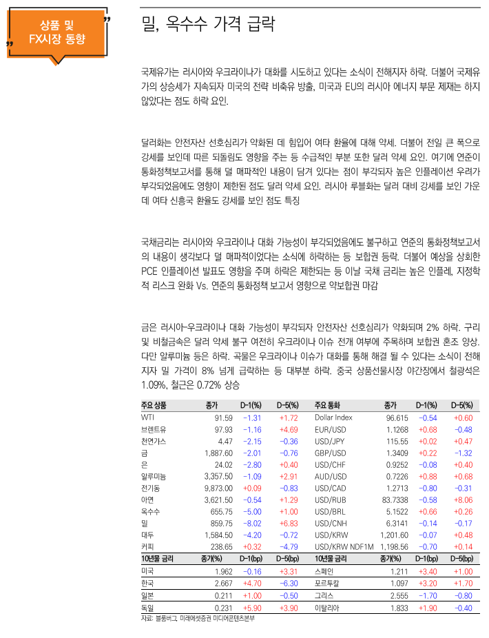 금일 섹터별 ETF는 소재(XLB/+3.7%), 금융(XLF/3.2%), 헬스케어(XLV/+3.1%), 커뮤니케이션(XLC/+1.6%), IT(XLK/+1.4%) 등 일제히 모든 섹터 상승 마감. 모자이크(MOS/+9.2%)는 최근 분기실적에서 동종 업계 대비 가장 좋은 실적을 발표하며 소재(XLB) 섹터 중 가장 많은 상승. 이어 뉴코(NUE/+7.6%)와 함께 상승 견인 마감. 러시아-우크라나간의 긴장감이 다소 완화되면서 금융(XLF) 섹터에서는 씨티그룹(C/+2.2%)과 뱅크오브아메리카(BAC/+3.3%)가 상승 견인 마감.