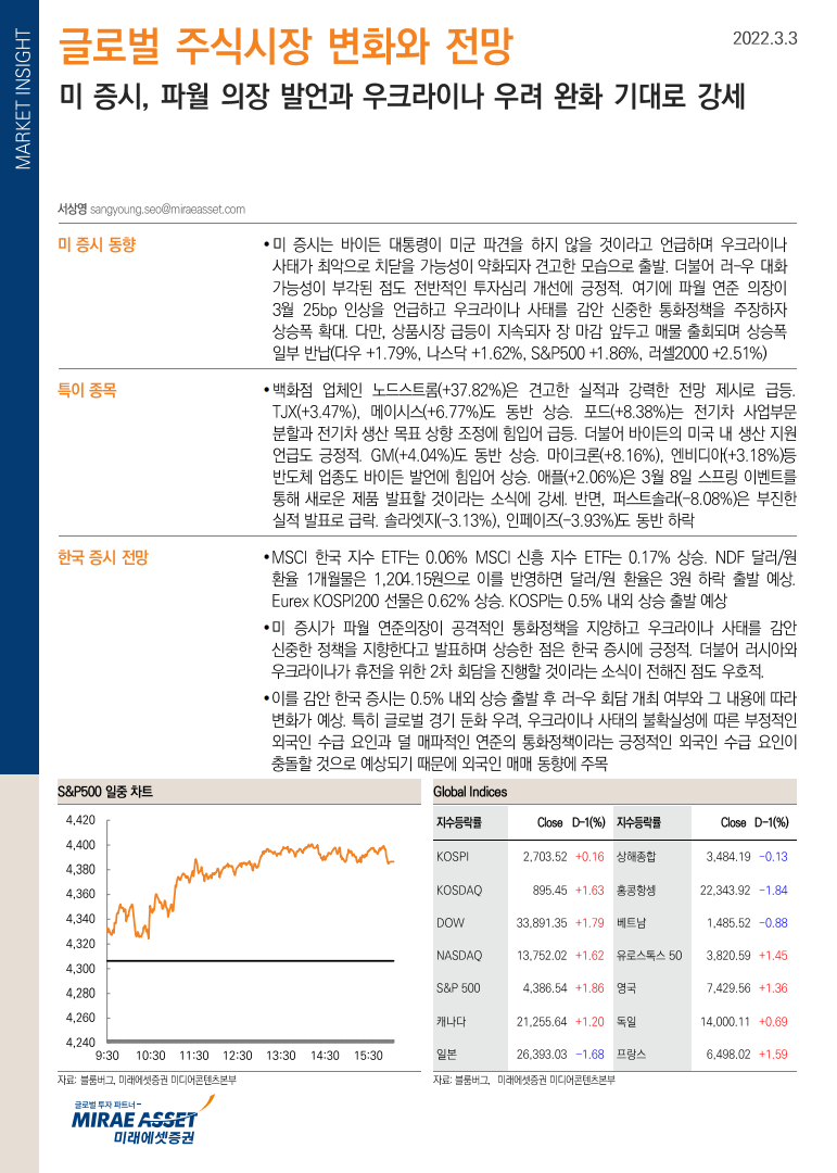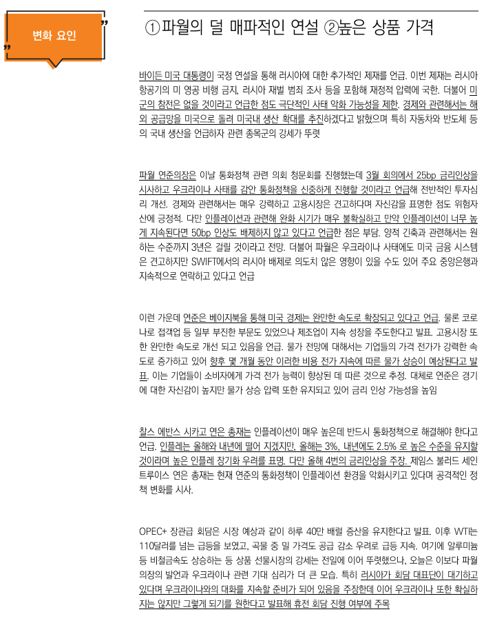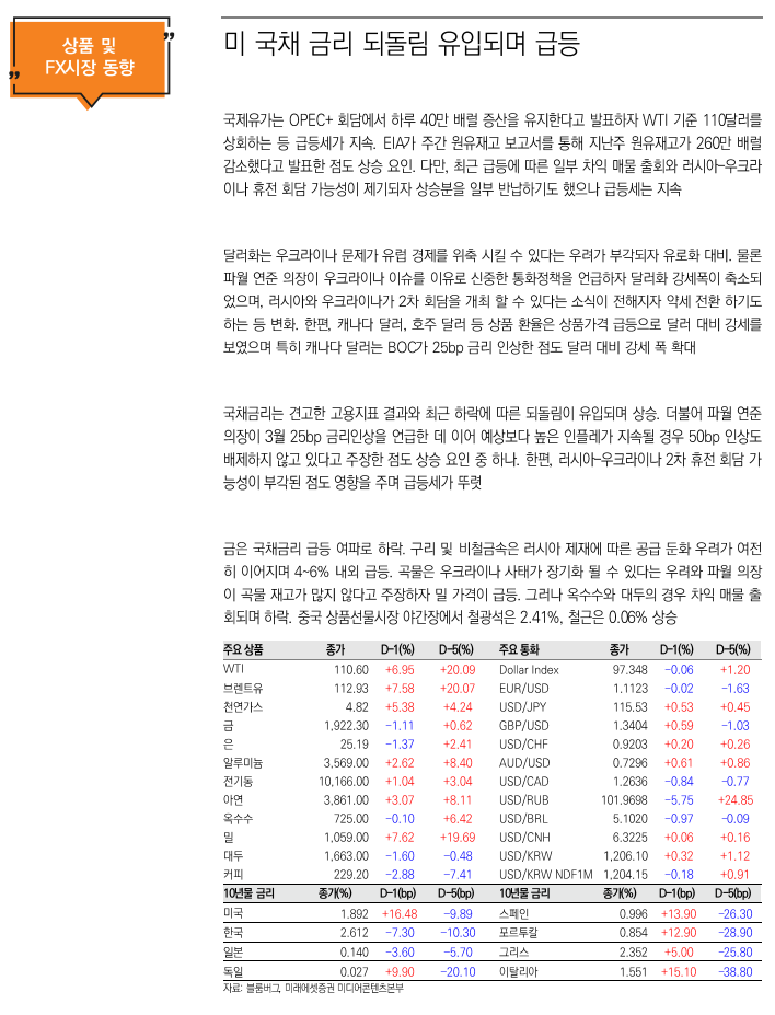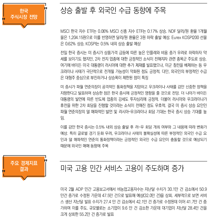 시장에서는 이날 미국 하원 금융위원회에 출석한 제롬 파월 연준(FED) 의장 발언에 주목. 파월 의장은 3월 금리 인상이 필요하다고 언급하면서도 조심스럽게 진행할 것이라고 발언. 파월 의장은 이달 예정된 연방공개시장위원회(FOMC) 정례회의에서 기준금리를 25bp 인상하는 것을 지지하며 인플레이션이 강할 경우 기준금리는 어떤 회의에서도 50bp 인상할 수 있음을 시사. 한편, 러시아가 우크라이나를 침략하면서 국제유가가 배럴당 100달러를 돌파했음에도 석유수출국기구(OPEC)와 러시아 등 비OPEC 산유국 협의체인 OPEC+가 하루 40만 배럴의 원유 증산 규모를 유지. 이날 발표된 주요 경제지표로는 미국의 2월 ADP 민간부문 고용이 47만5천 명으로 집계돼 월가의 예상치를 웃도는 수준을 기록. 한편, 유럽연합은 러시아 은행 7곳에 대한 국제은행간통신협회(SWIFT0 퇴출 제재를 단행하는 등 러시아•우크라이나 리스크가 지속. 시장에서는 이날 예정된 우크라이나와 러시아의 2차회담에 주목하고 있는 모습.
