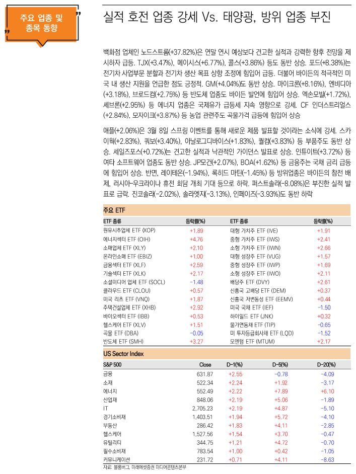 금일 섹터별 ETF에서는 금융(XLF/+2.6%), 에너지(XLE/+2.3%), IT(XLK/+2.2%) ETF가 상승. 국제유가가 약 8년 만에 최고가를 기록한 가운데, 원유 관련주가 일제히 강세를 보이며 에너지(XLE) ETF가 상승. 원유 관련주의 강세를 러시아의 우크라이나 침공이 장기화하면서 국제유가가 급등한 영향으로 풀이. 서방의 러시아에 대한 제재로 원유 수급 차질에 대한 우려가 증폭. 미국 석유서비스 기업 베이커휴즈(BKR)가 7.3% 상승, 석유기업 옥시덴털 페트롤리엄(OXY)가 3.4% 상승. IT(XLK) ETF에서는 2주전 실적호조와 함께 발표했던 수익과 매출 전망을 우크라이나 사태로 인한 불확실성으로 철회한다고 밝히며 폭락했던 소프트웨어 기업 이펨 시스템스(EPAM)가 저가 매수세에 16.1% 상승, 미국 기업용 클라우드 서비스 제공 기업 휴렛 팩커드 엔터프라이즈(HPE)가 시장 예상치를 웃도는 실적을 발표할 것이라는 전망과 함께 10.3% 상승.