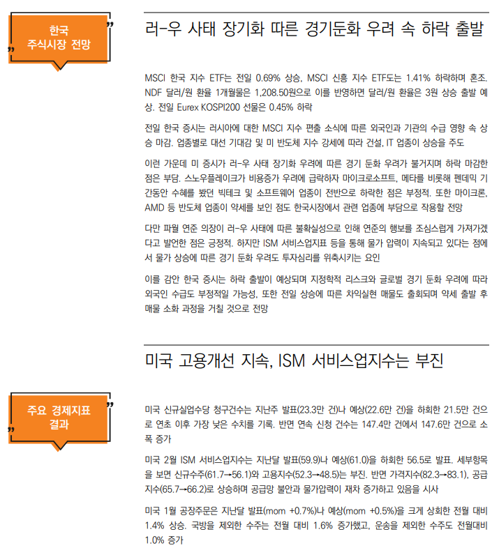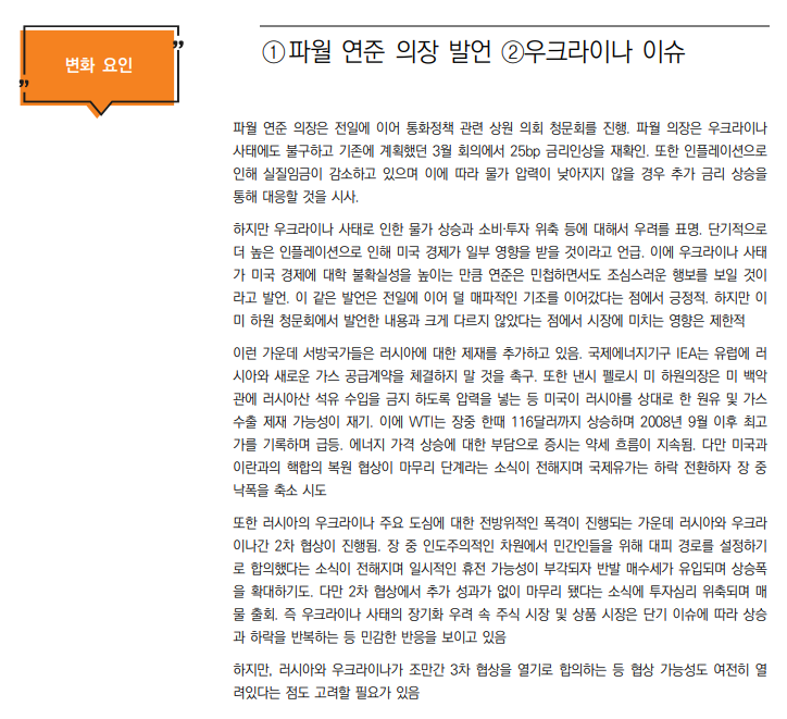 미국 증시는 제롬 파월 연준(FED) 의장의 발언과 러시아•우크라이나 교전에 주목하며 약세로 마감. S&P500지수는 0.5% 하락한 4,363선에서 거래를 마쳤고, 다우지수는 0.3% 하락해 33,794.66에 마감. 나스닥 지수는 1.6% 내린 13,537.94에 마감. 시장에서는 제롬 파월 의장의 의회 증언, 러시아와 우크라이나 교전에 따른 유가 폭등 등에 주목하고 있는 모습. 파월 의장은 하원 금융서비스 위원회에 출석해 3월 예정된 연방공개시장위원회(FOMC)에서 연방기금금리를 25bp 인상하는 것을 지지한다고 언급하며 시장의 불확실성이 일부 해소. 러시아와 우크라이나의 교전이 지속하는 가운데 양측은 2차 회담을 시작했지만, 타협점을 찾을 수 있을지는 불확실한 상황. 이날 발표된 주요 경제지표로는 미국의 2월 서비스 구매관리자지수(PMI) 확정치가 56.5로 최종 집계돼 전월치인 51.2에 비해 개선된 수준을 기록. 정보제공업체 IHS마킷은 미국내 오미크론 변이 확산세가 진정되면서 경기가 개선됐다고 설명. 미국의 주간 실업보험 청구자 수는 전주보다 1만8천 명 감소한 21만5천 명을 기록. 러시아와 우크라이나 교전이 지속하는 가운데 이번 달부터 미국 연준(FED)의 금리인상 사이클을 시작으로 양적긴축이 예정돼 있어 시장의 높은 변동성이 지속할 것으로 예상.