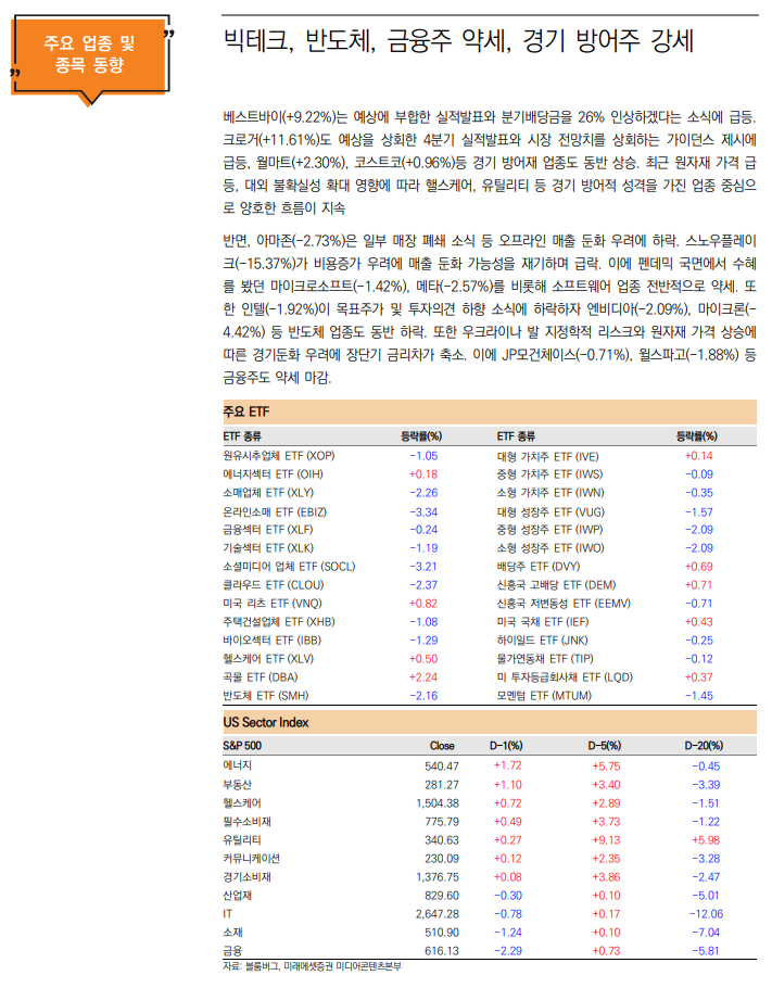 금일 섹터별 ETF에서는 부동산(VNQ/+0.8%), 필수소비재(XLP/+0.8%), 헬스케어(XLV/+0.5%) ETF가 상승. 필수소비재(XLP) ETF에서는 미국 종합유통체인인 크로거(KR)가 시장예상치를 웃도는 실적 발표에 11.6% 상승, 주류기업 브라운포맨(BF.A)가 실적 발표를 앞두고 6.3% 오르며 필수소비재(XLP) ETF 상승을 주도. 헬스케어(XLV) ETF에서는 미국 제약기업 일라이릴리(LLY)가 파트너사 인사이트(Incyte)와 공동개발한 관절염 치료제가 신종 코로나 바이러스에 의한 사망률을 급격하게 낮춘다는 영국 연구자료에 1.8% 상승, 미국 제약사 바이오젠(BIIB)에 대한 캐나다 RBC은행의 투자의견 상향조정에 1.7% 상승.