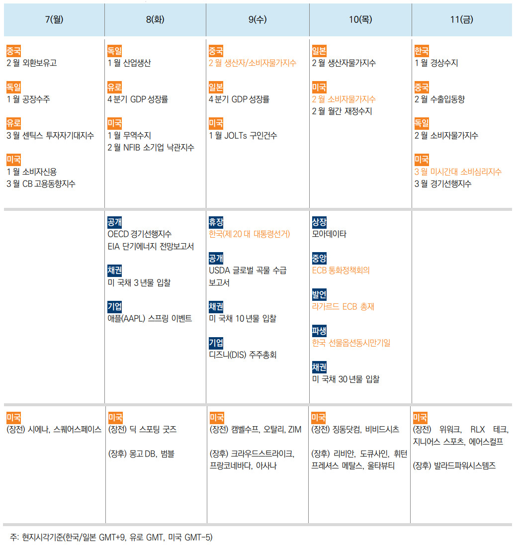 >금주 중국 주요 일정 : 중국 1-2월 수출입 (7일), 중국 2월 물가 (9일), 중국 2월 통화량/유동성/대출 (9일~), 전인대 폐막과 기자회견 (11일)