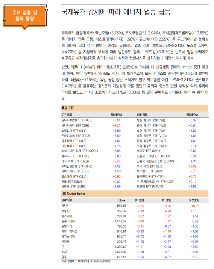 금일 섹터별 ETF에서는 에너지(XLE/+2.9%), 유틸리티(XLU/+2.2%), 헬스케어(XLV/+0.5%) ETF가 상승. 러시아의 우크라이나 원자력 발전소 폭격 소식에 에너지 위기감이 재확산됐고, 미국이 러시아산 원유 수입 금지를 검토하고 있다는 소식에 국제유가가 급등하며 에너지(XLE) ETF 강세의 주요 원인으로 작용. 미국 백악관은 지난 3일 러시아산 원유 수입 금지 여부에 유가와 휘발유 가격이 더 오를 수 있는 가능성에 러시아산 원유 수입 금지는 고려하지 않다고 선을 그었으나 이를 요구하는 목소리도 높아지고 있는 상황. 세실리아 라우즈 백악관 경제자문위원회 의장은 바이든 행정부가 러시아산 원유를 즉시 보충하기 위해 무엇을 할 수 있는지 검토하고 있다고 언급. 한편, 러시아의 우크라이나 침공 사태로 글로벌 증시가 약세를 보이는 가운데 유틸리티(XLU), 헬스케어(XLV), 필수소비재(XLP) ETF가 자산시장의 피난처로 주목되며 상승 마감. 특히 헬스케어(XLV) 종목은 경기 변동에도 흔들리지 않는 경기방어주로 헬스케어 기업 평균 부채비율은 약 80%로 필수소비재(115%)와 유틸리(150%) 섹터보다도 낮은 수준을 유지. 이날에는 유니티드헬스그룹(UNH/+2.5%), 텔레플렉스(349.98/+1.9%), 데스컴(DXC/+1.9%) 등이 헬스케어(XLV) ETF 상승을 주도.