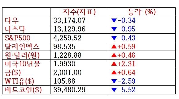 이날 다우지수는 전날보다 113.23포인트(0.34%) 내린 3만3173.02로 마감했다. S&P500지수는 18.48포인트(0.43%) 내린 4259.40으로 장을 마쳤다. 나스닥지수는 125.58포인트(0.95%) 내린 1만3129.96으로 거래를 마쳤다.