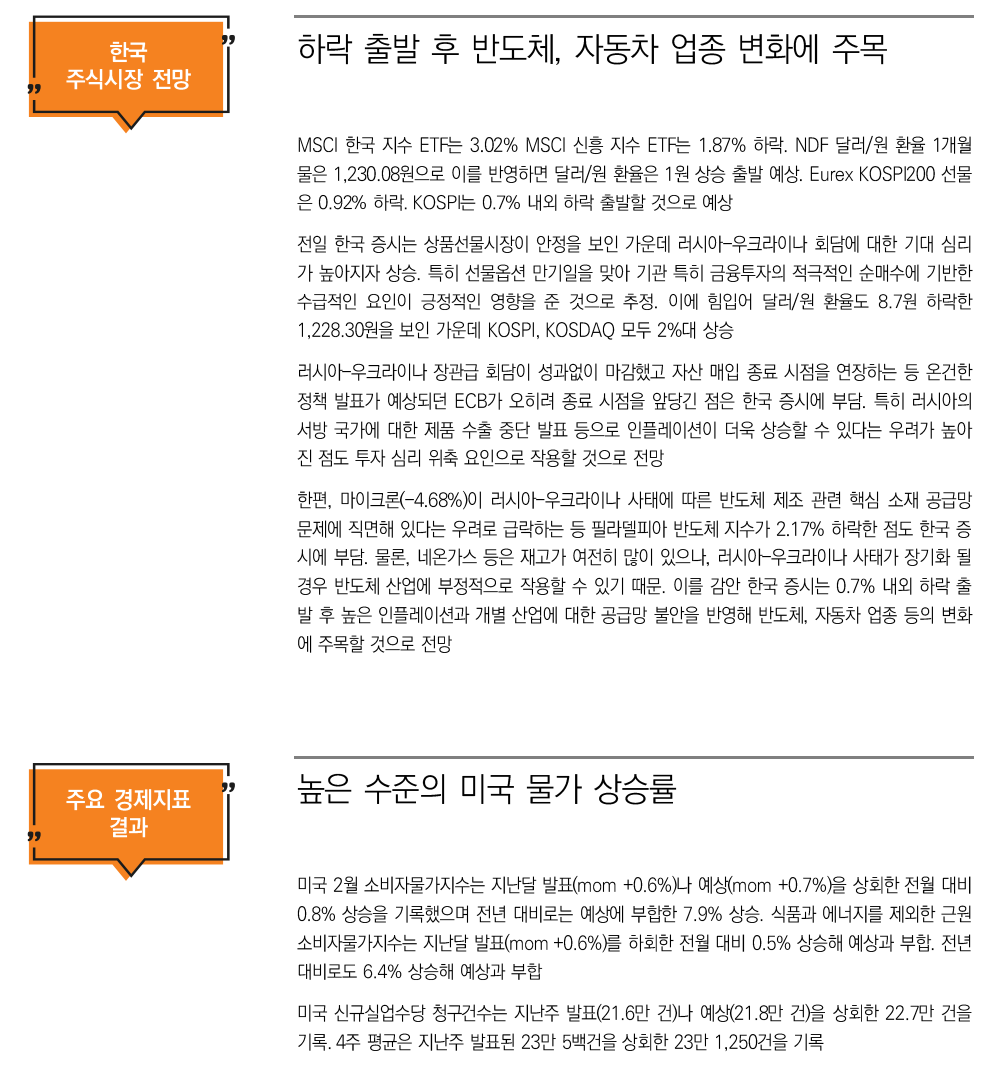 테마별 ETF는 글로벌 천연자원(GNR/+2.2%)ETF가 상승한 반면, 기술혁신(ARKK/-3.6%) ETF는 하락 마감. 러시아와 우크라이나의 회담이 성과 없이 종료되었다는 소식이 전해지며 엑슨모빌(XOM/3.12%)과 같은 글로벌 에너지 기업들이 강세를 시현, 글로벌 천연자원 섹터의 상승 압력을 지지. 반면 기술혁신 ETF에서는 러시아의 경제제재가 지속되며 니켈을 비롯한 원자재 상승을 야기. 이에 차량용 반도체에 대한 글로벌 공급망 악화가 미국의 전기차 생산업체 테슬라(TSLA/-2.4%)의 주가 하락에 기인하며 기술혁신 ETF의 하방 압력을 가중.