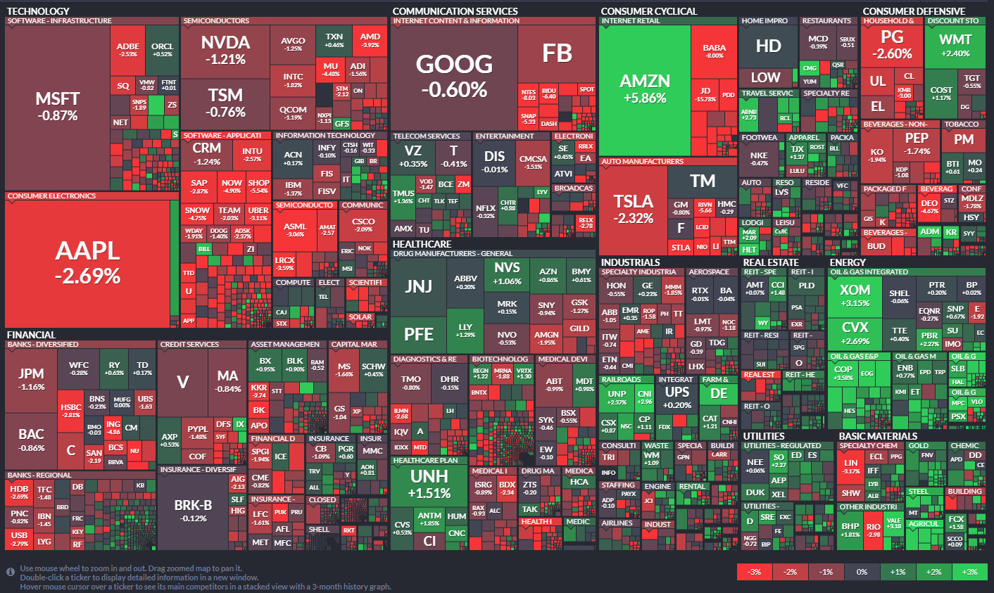 기술주는 대체로 약세를 보였다. 줌(-5.27%)과 애플(-2.72%), 메타(-1.66%) 등이 하락했다. 반면 주식분할과 자사주 매입을 발표한 아마존은 5.41% 뛰었다.